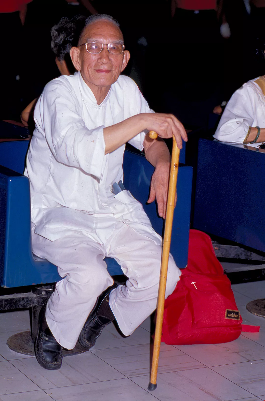 臨回香港,在桃園國際機場,老先生依舊是一襲素白唐裝,神情自在。(張良綱)