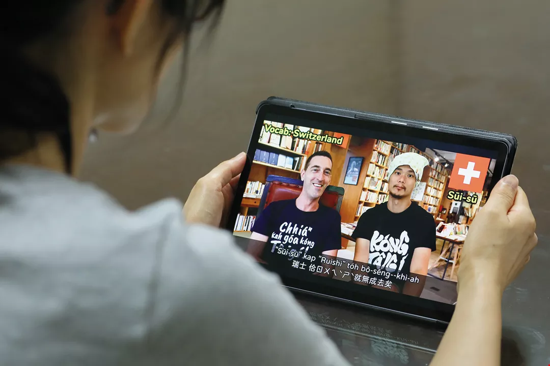 賴咏華和在台灣的紐約人阿勇一起拍攝「英台EXPRESS」,用台語和英文討論新聞,台語也能成為日常溝通的語言。