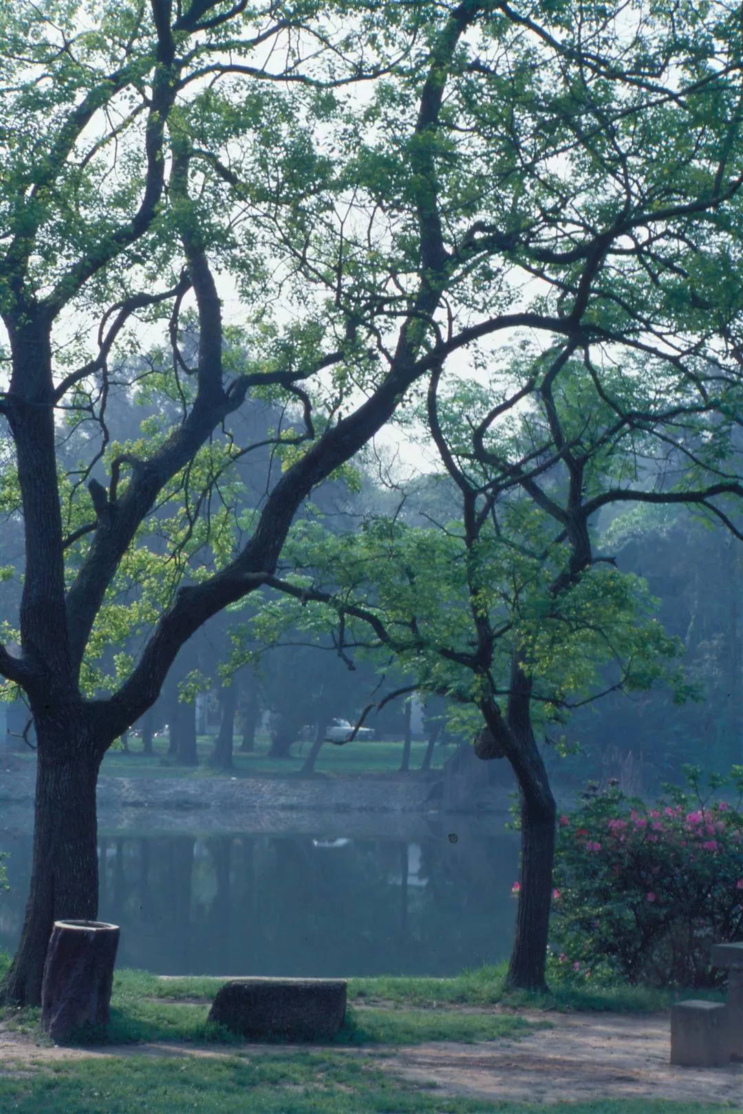 圖1.2:位於清大校園中心的成功湖,湖面清澈,湖畔綠樹成蔭,湖上有小橋、亭台,湖上可氾小舟,景緻怡人。(楊永山)
