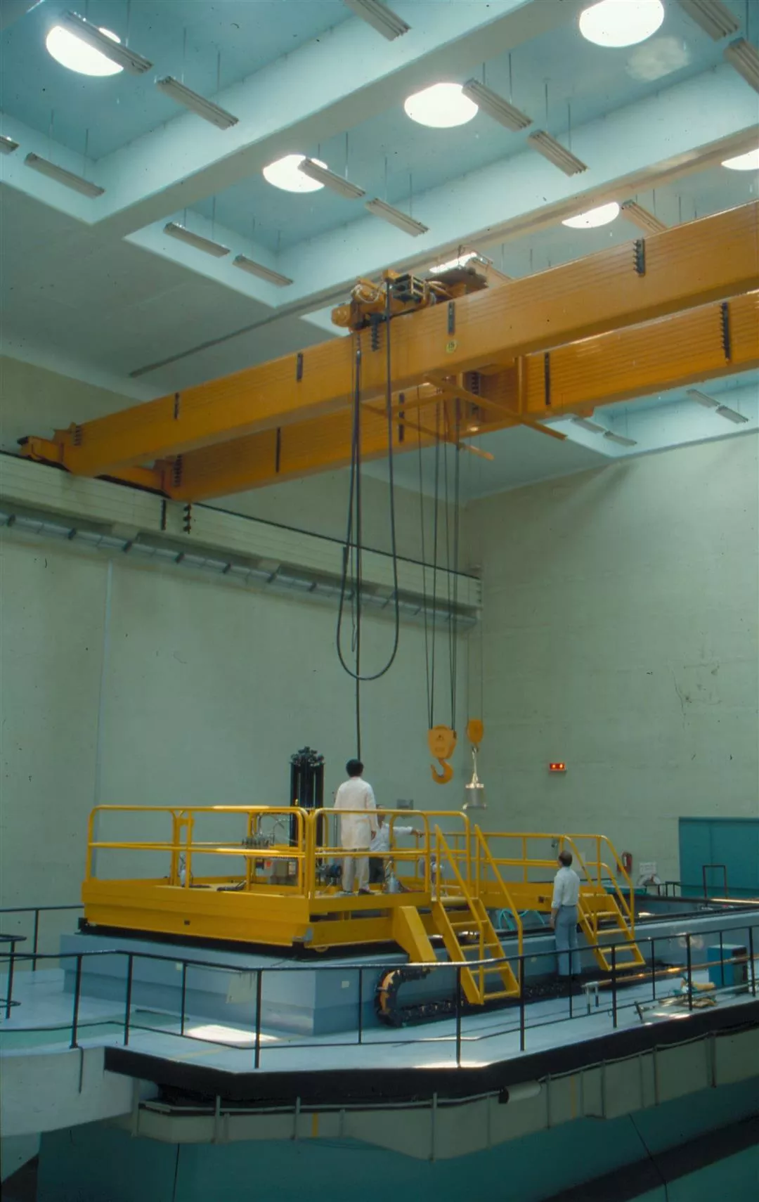 圖1.2:水池式反應器是清大原科院的第一座教學用反應器。圖1.為技術員以器械吊升反應用燃料棒的情形。(楊永山)