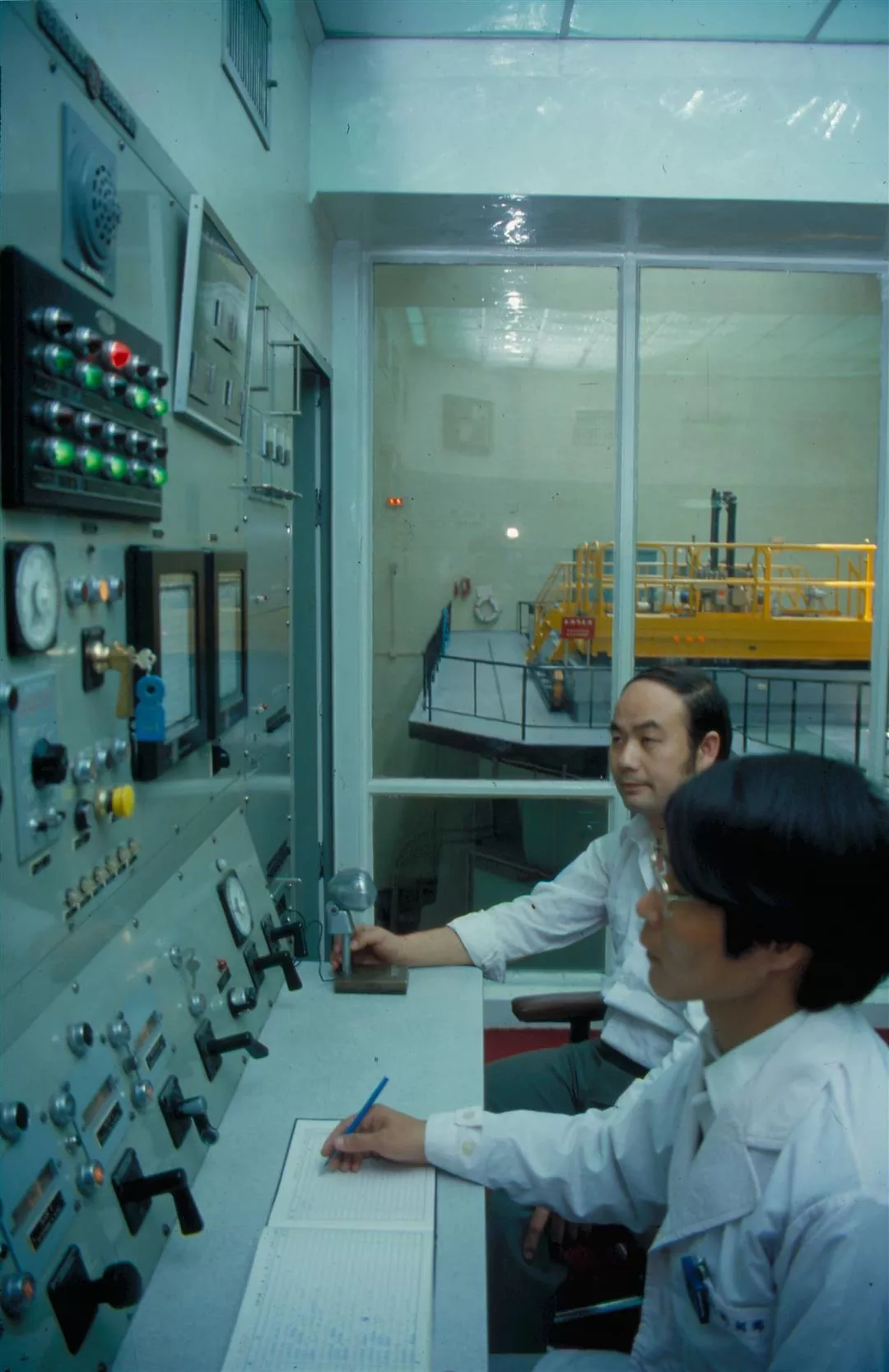 圖2.為技術員在控制室觀察反應器運轉。(楊永山)