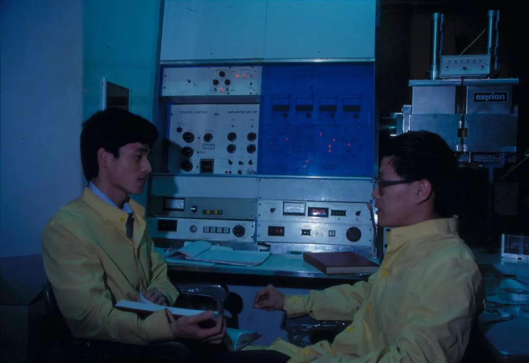圖4:物理研究所研究生在離子布植器旁討論半導體特性。(楊永山)