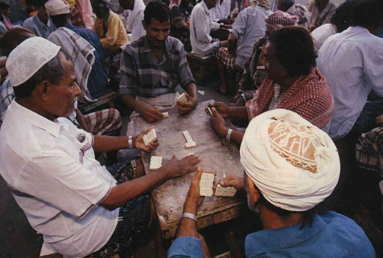 是葉門海港亞丁的市場一景,當地人正聚精會神地賭中國國玩──牌九。(經典雜誌提供,上圖.蕭耀華攝,右圖.洪海彭攝)(經典雜誌提供,上圖.蕭耀華攝,右圖.洪海彭攝)
