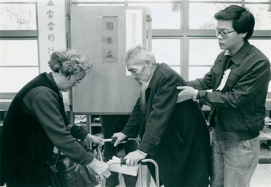 右圖:投票所工作人員攙扶行動不便的老人投票。(本刊攝影小組)