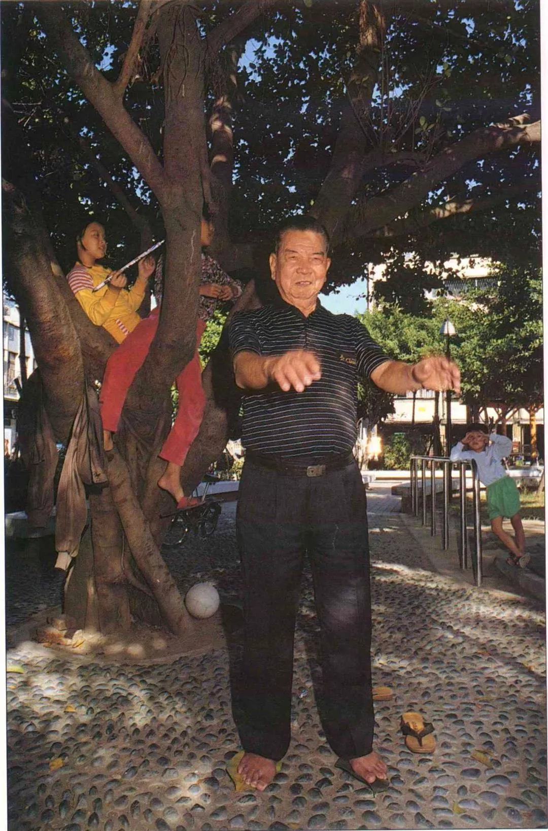 早晨十點多的公園,是老人、婦女及小小孩的天下。難得連日東北季風帶來的陰霾被陽光蒸融,公園中央廣場許許多多小身影,在五彩鮮豔的迴旋梯中鑽進鑽出。不過可不能玩得太肆無忌憚,因為坐在外圍木扶椅的阿公阿媽們,看似閒話家常,眼睛卻一刻也沒放鬆。而剛從菜市場回來的媽媽經過這裡,也不知不覺放緩腳步,跨過矮欄,走入樹蔭下的健康步道,偷得浮生半刻閒。