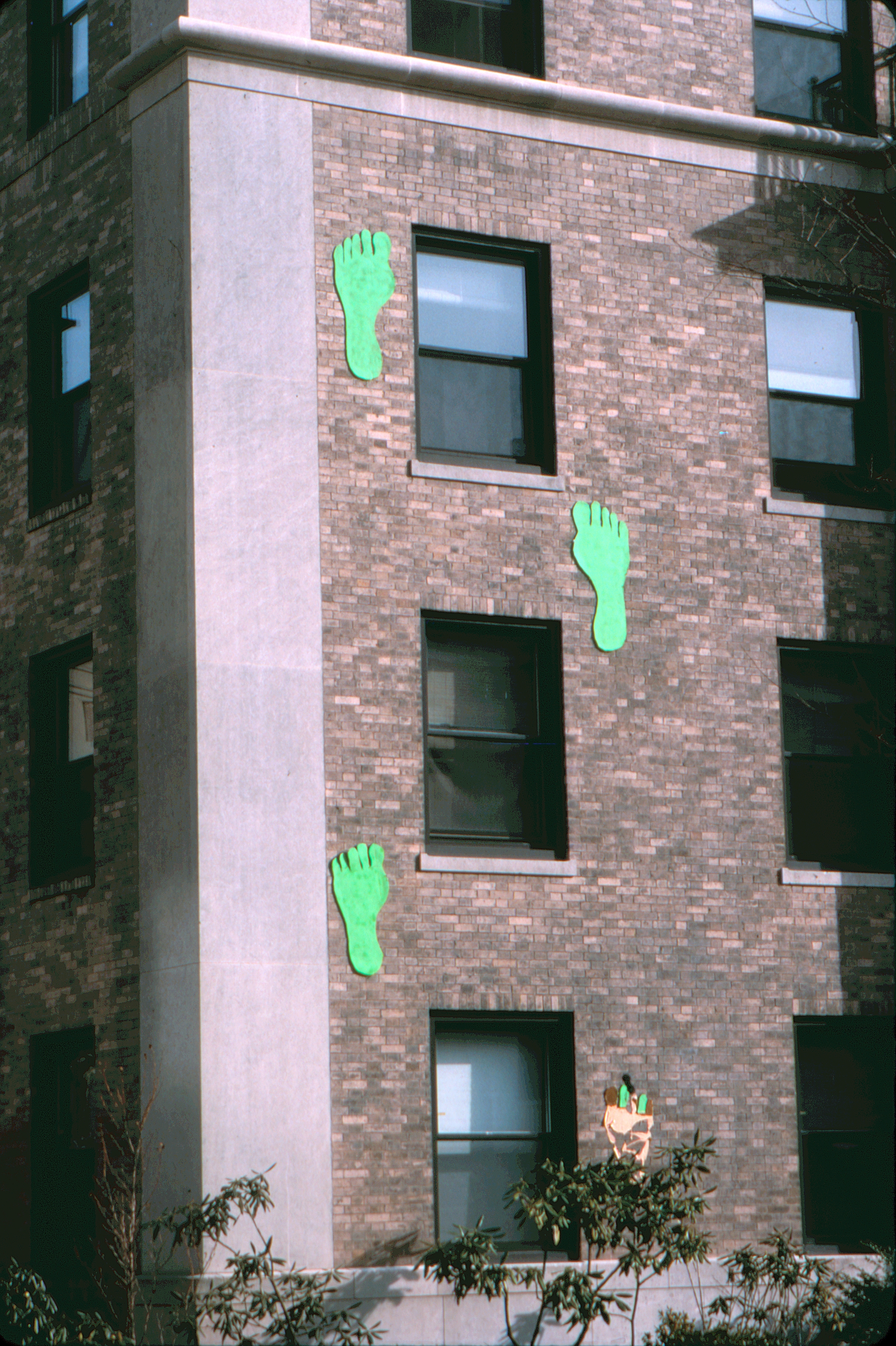 大學部學生頑皮地為宿舍貼上綠色大腳印。(鄭元慶)