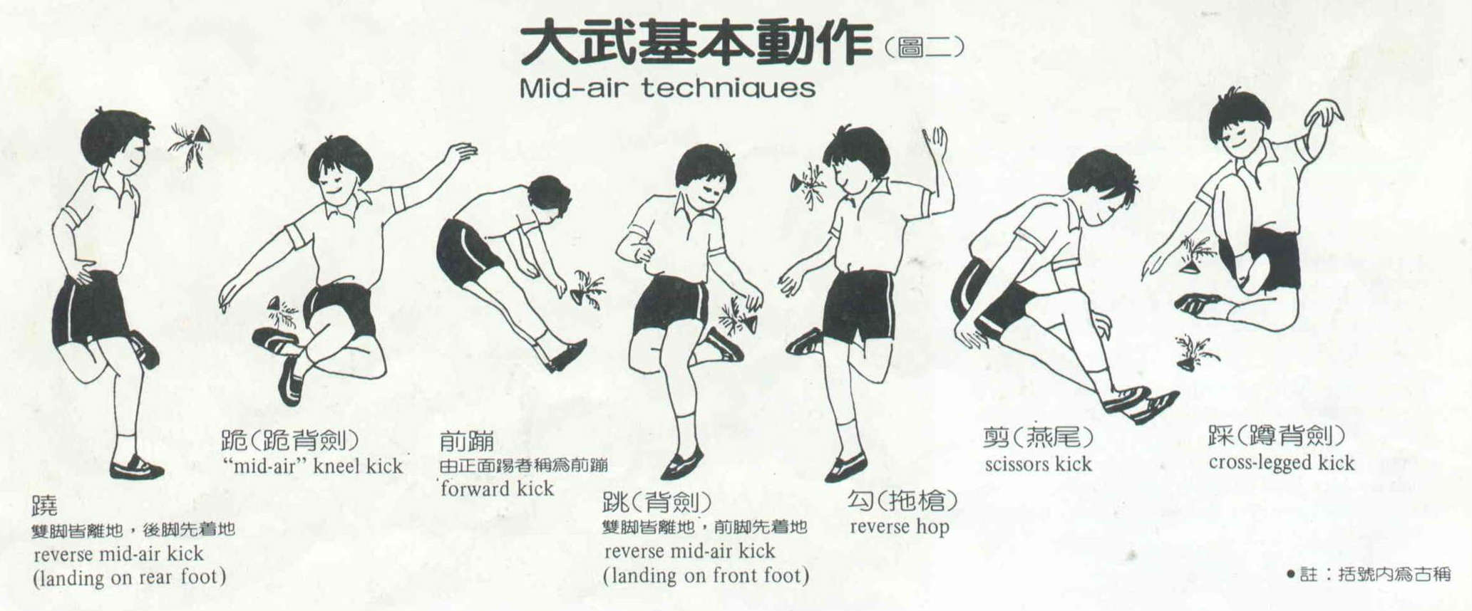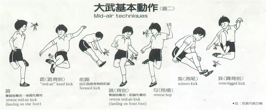 武踢又叫「大武」,踢時雙腳離地,躍起在空中踢,為保持平衡,通常還加上手部動作。這些「空中動作」也各有名稱,如跳起來往後勾踢的「跳」、「躍」(兩者不同在一為前腳,一為後腳先著地),一腳高一腳低,成蹲跪狀的「跪」,兩腳伸直作剪刀狀的「剪」等(如圖二)。