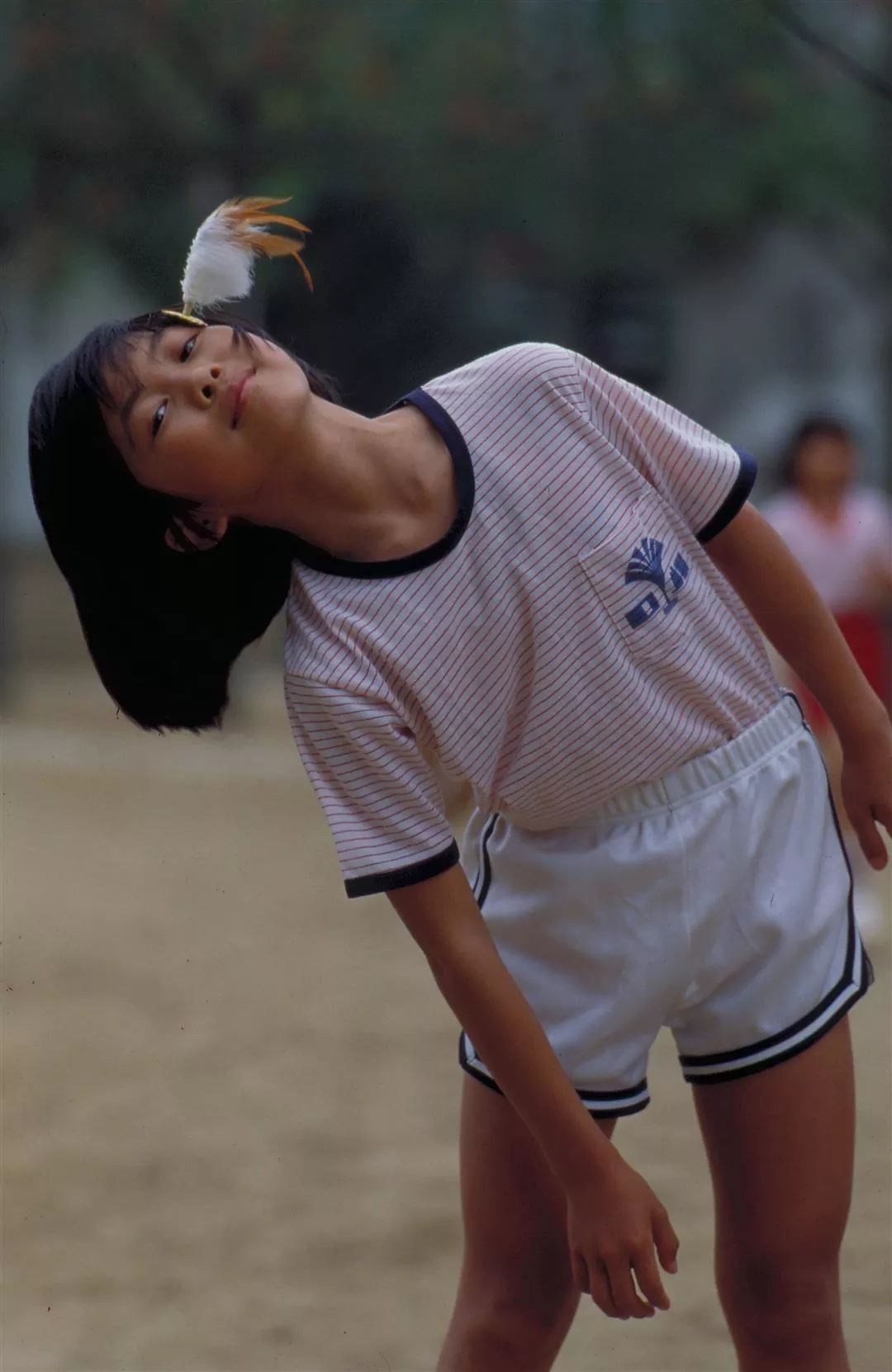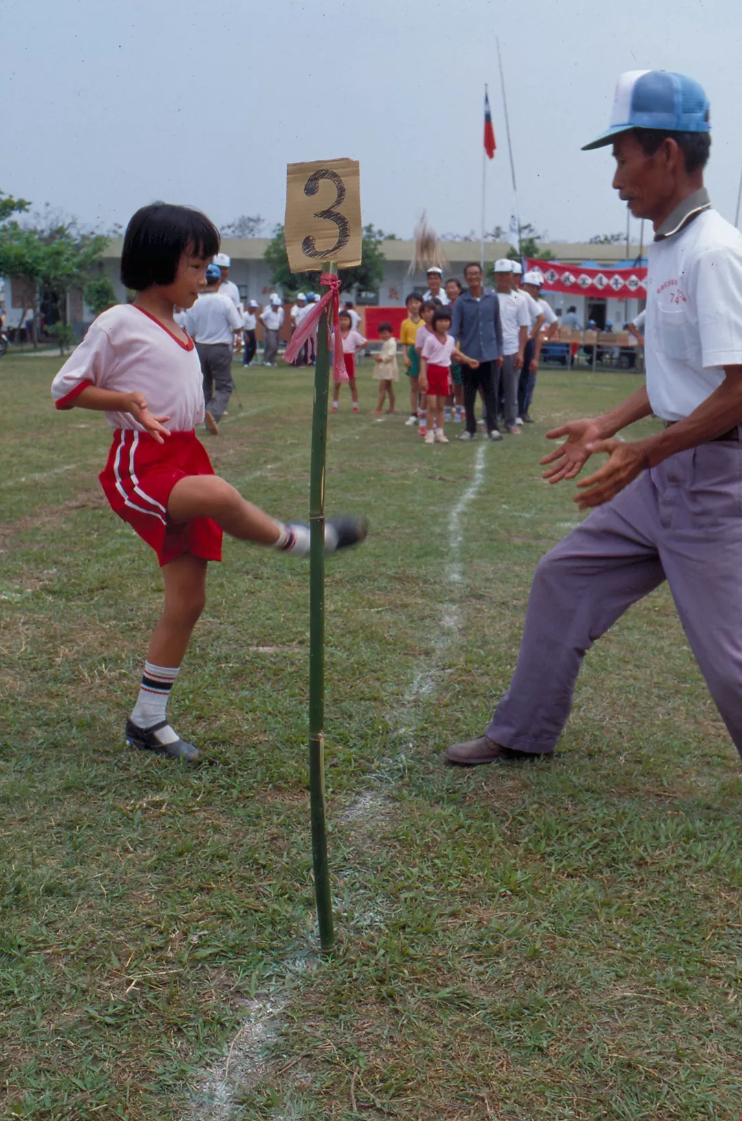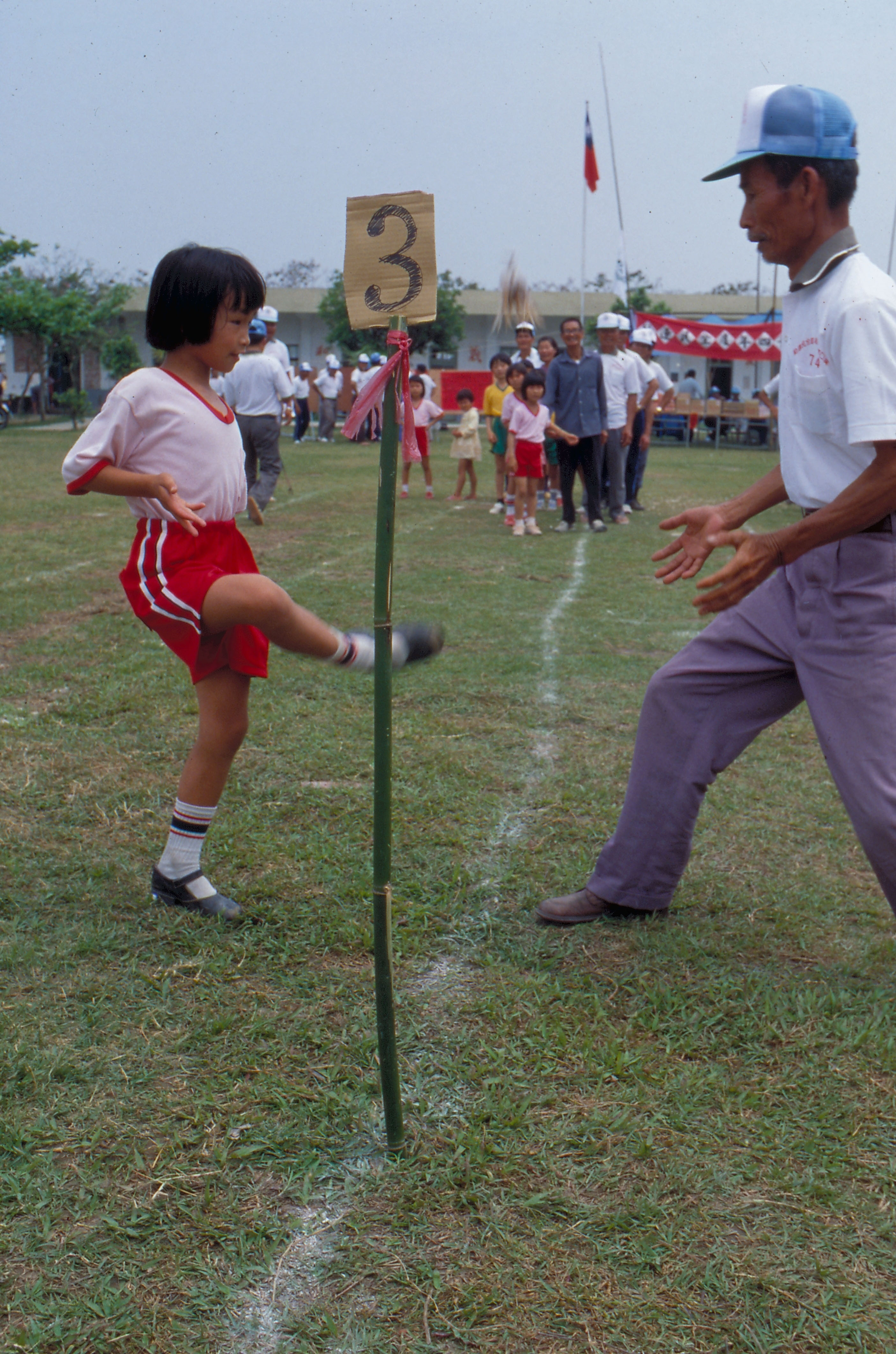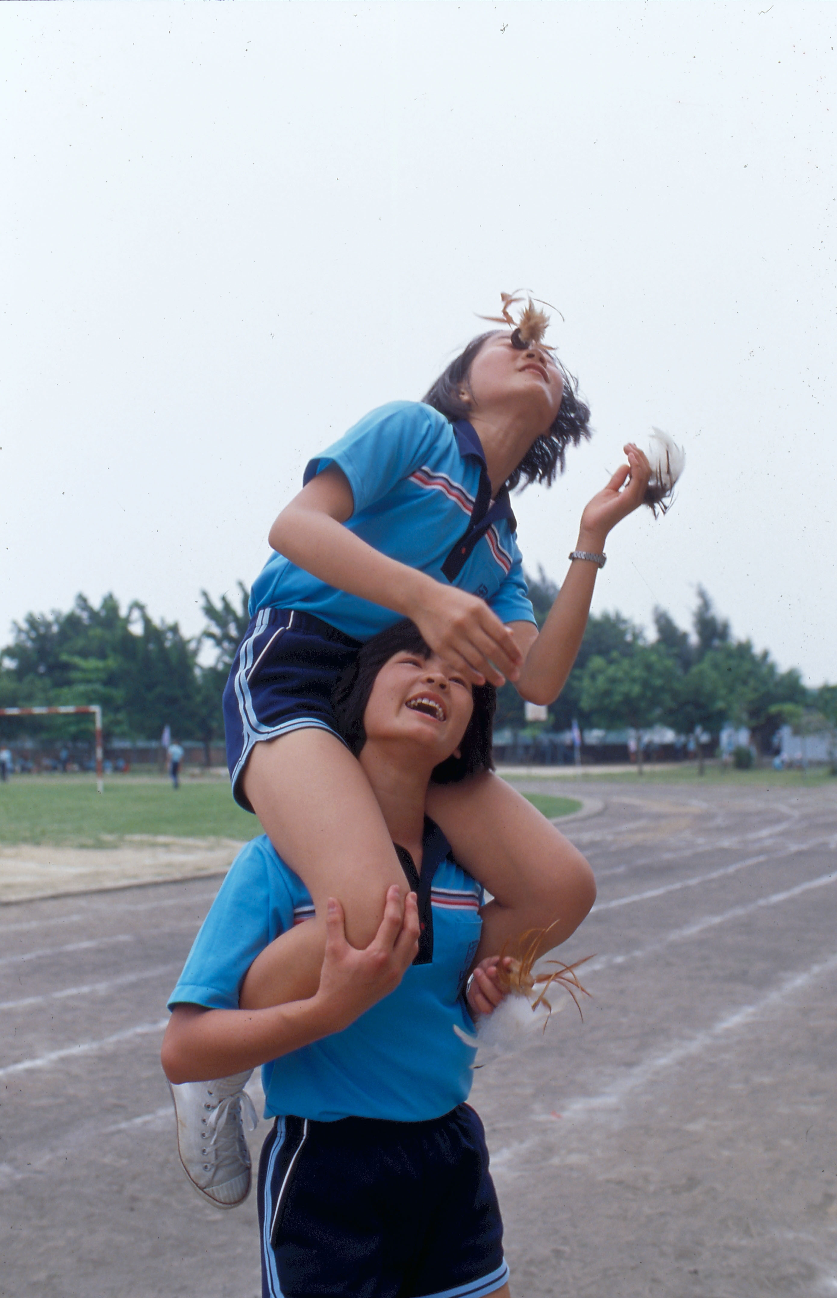 在社區運動會中,還有「父子同樂」的賽毽項目。兒子踢毽,父親接了,再丟回去;比賽二隊各由數對父子檔組成,一路接接踢踢,先輪完的那隊獲勝。