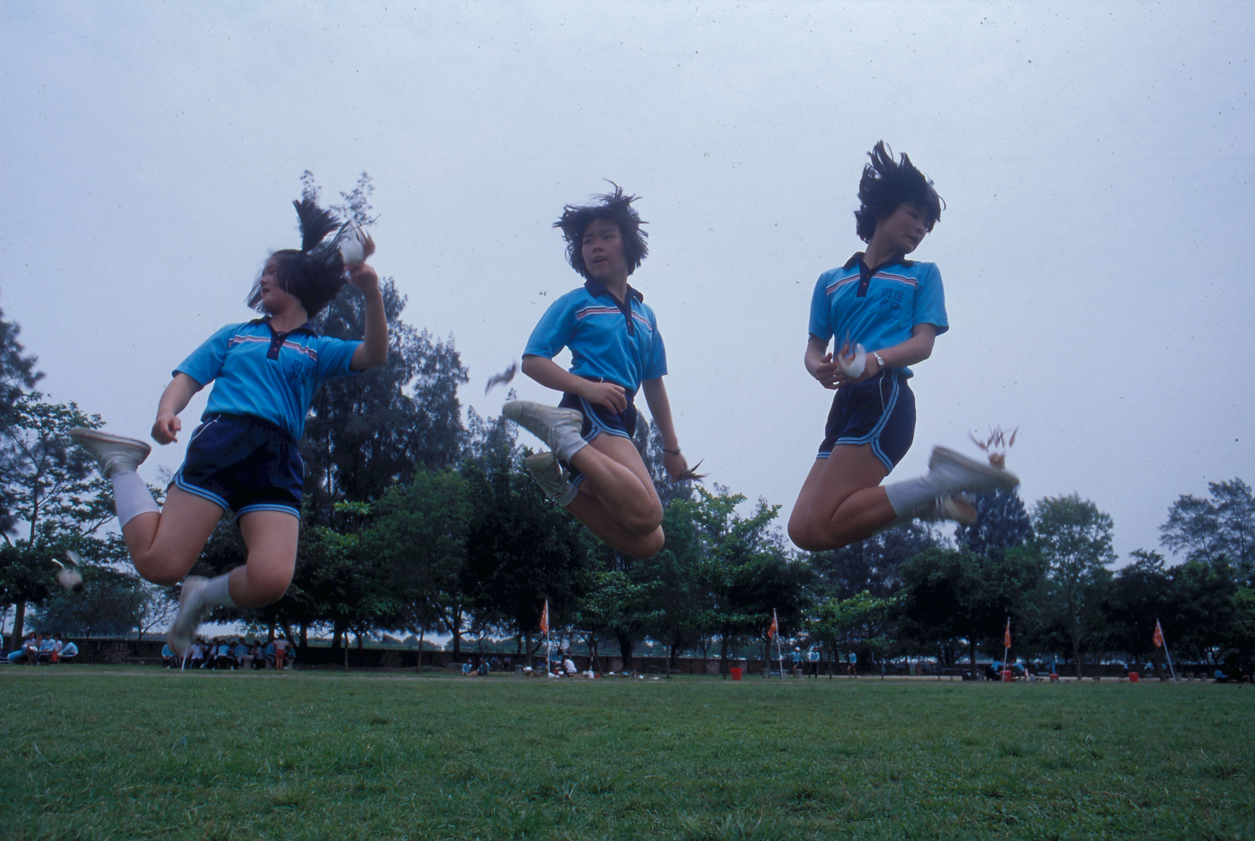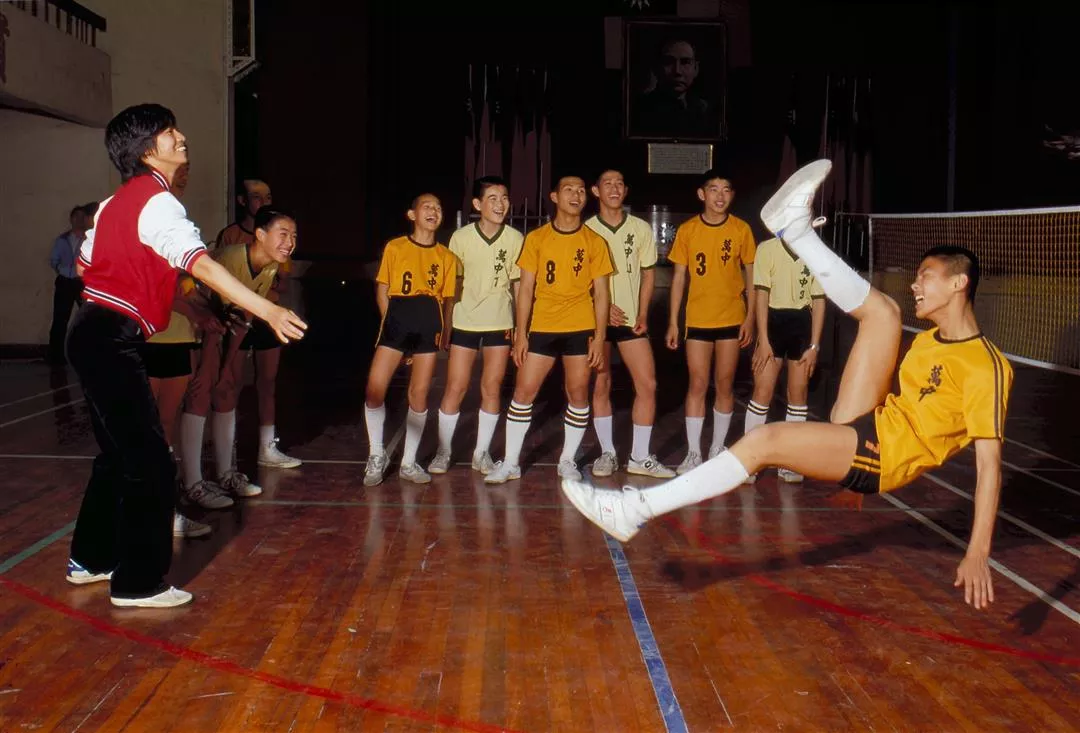圖2.:毽球運動在台北市各中學流行,圖為萬華國中毽球隊,學生表演的一「腳」絕活——倒掛金鉤。(張良綱)