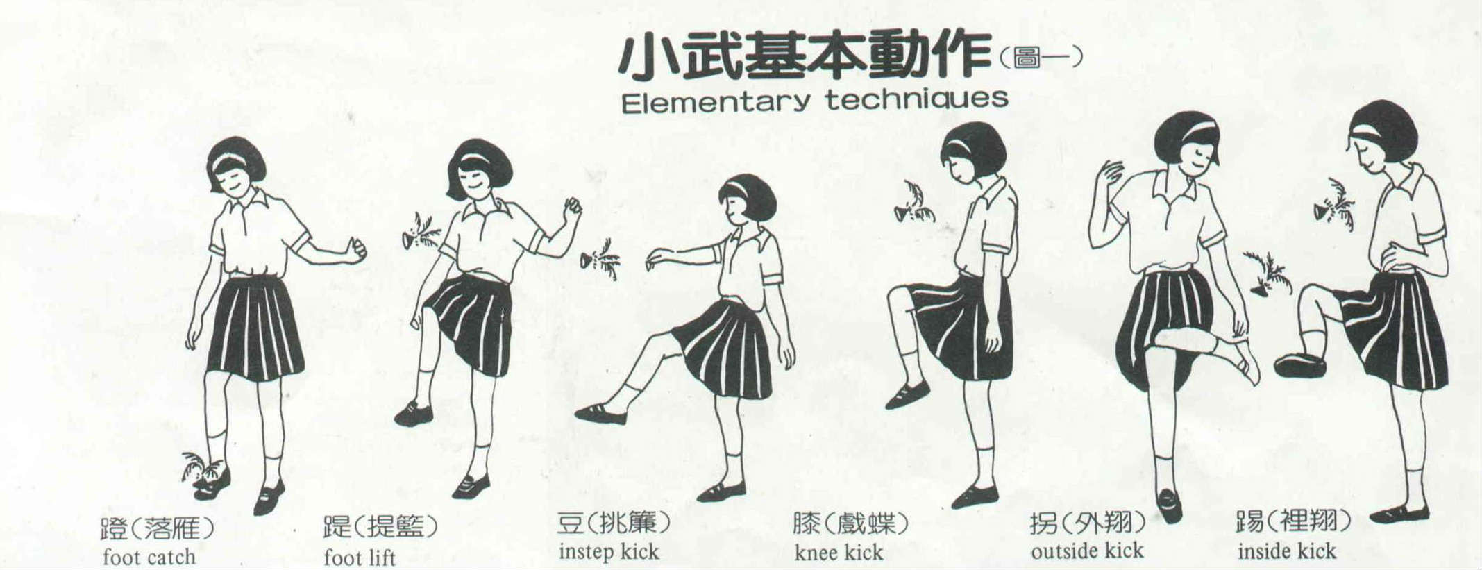 文踢也稱「小武」,一腳直立,一腳踢毽,是最簡單的踢法。主要的基本動作有:將毽往裏踢的「踢」、往外勾的「拐」、碰膝的「膝」、腳伸直以腳背踢的「豆」等(如圖一)。