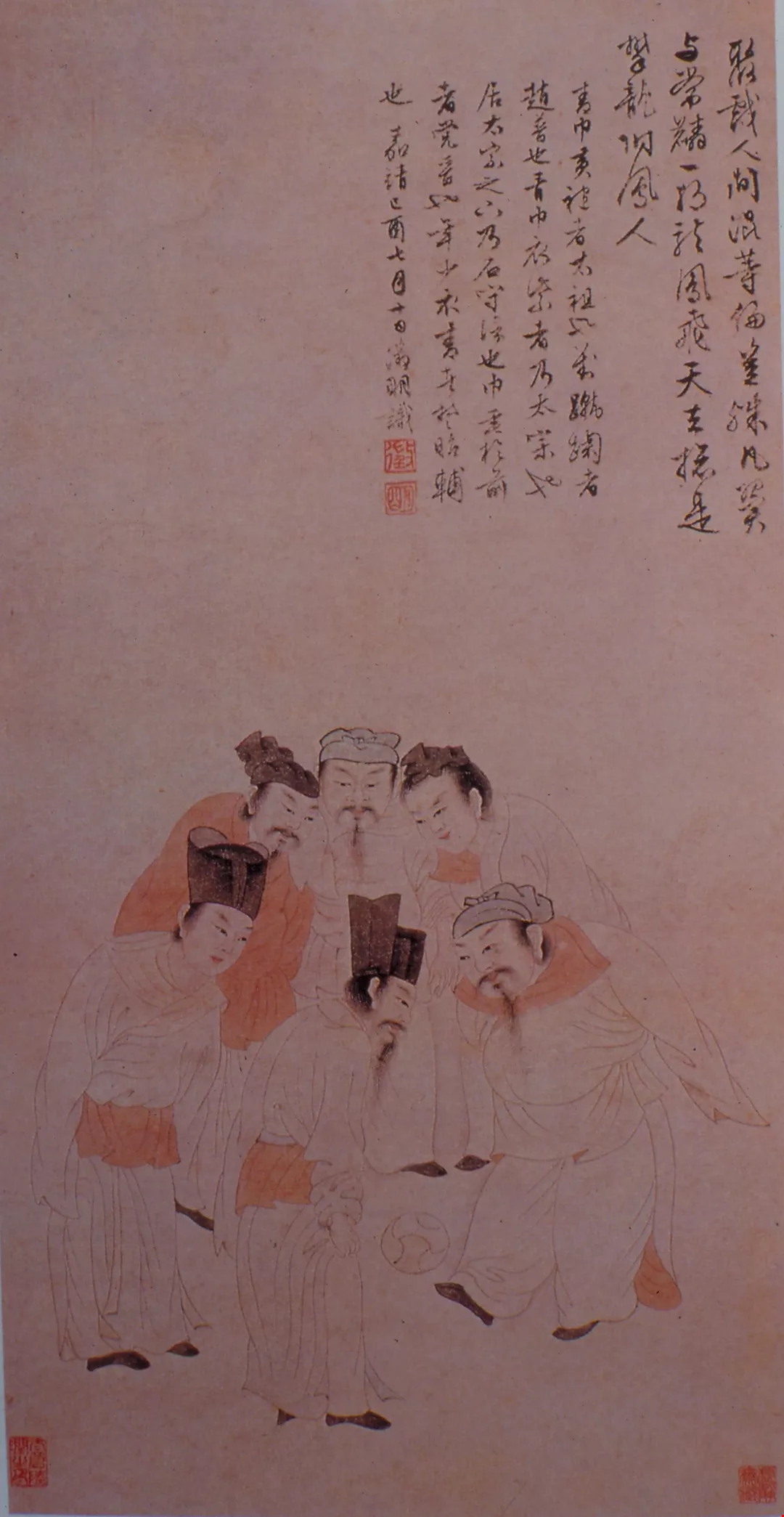 圖1.:明朝文徵明所畫的「蹴踘圖」。圖中的「球」,是毽子的前身——蹴踘。此圖描繪宋朝宮廷玩球戲的情形,抬腿踢球的人是宋太祖趙匡胤。(張良綱)