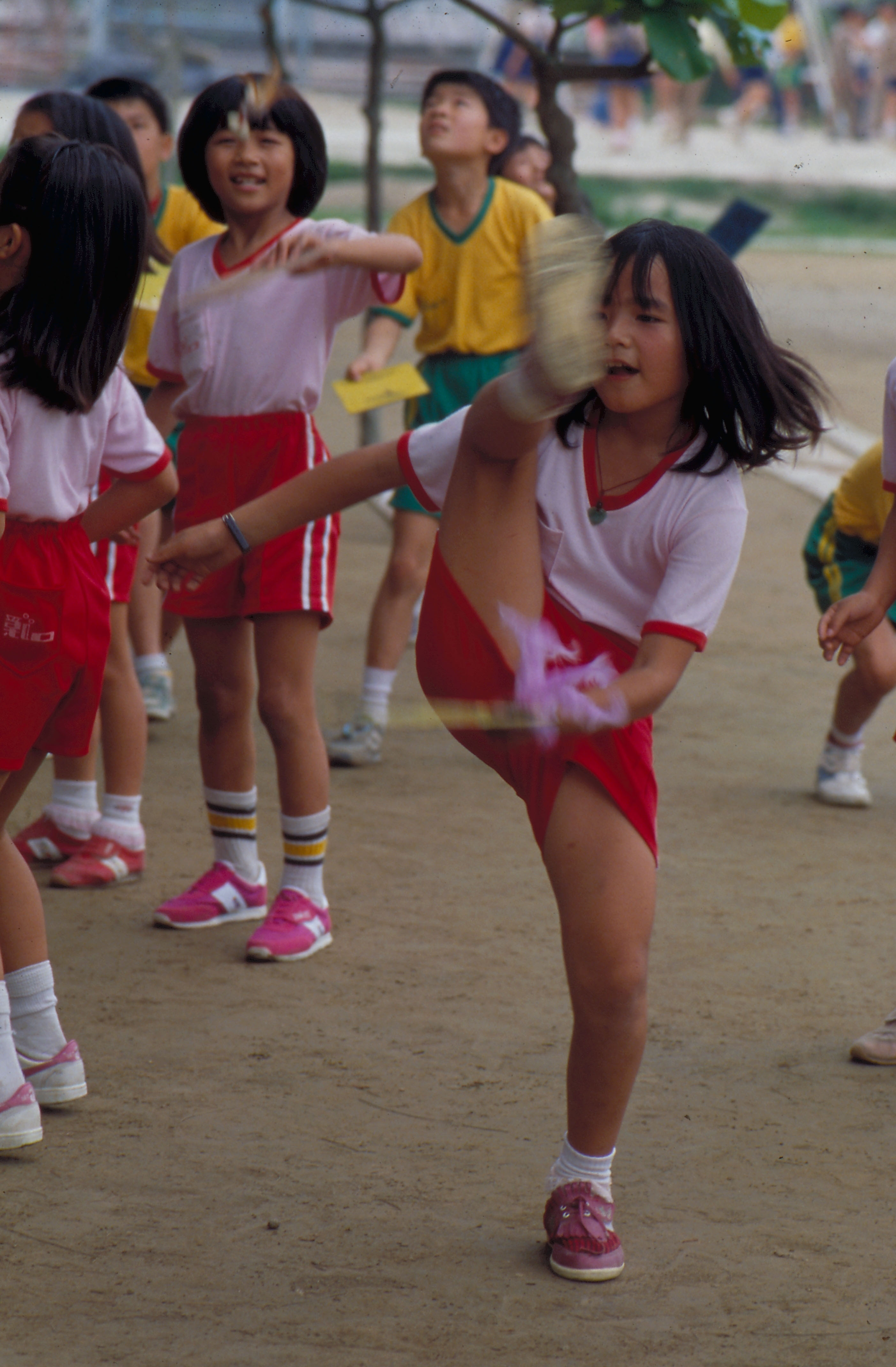 放學鐘響了,小朋友在歸家的路上,走著走著,就在農家的稻埕、或人家的庭院玩將起來,有的自得其樂地耍耍拿手好戲,有的則三兩成群,各顯神通。
