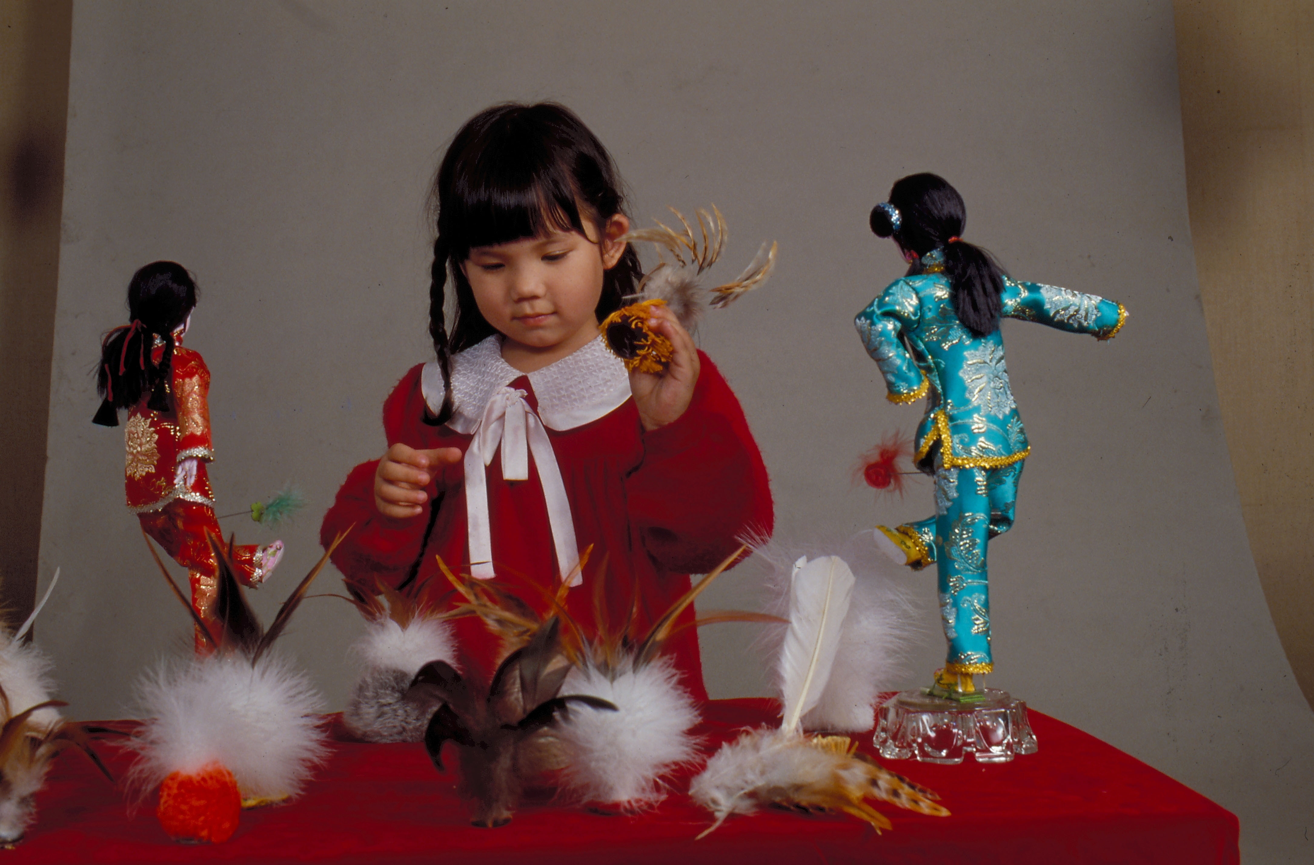 圖2.:毽子可憑個人巧思,變化出不同的樣子,圖中小女孩手上抓的、玩偶腳上踢的,以及桌面上擺著的是各式各樣不同的毽子。(張良綱)