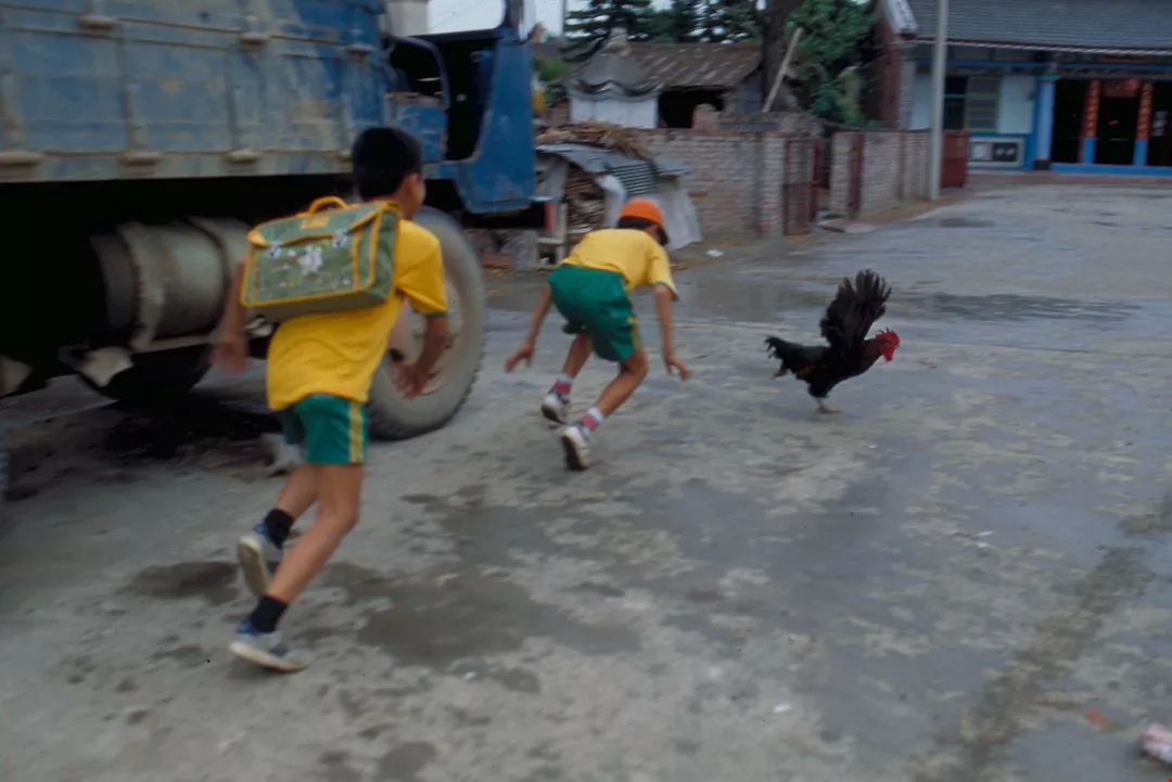 圖3.:人腳一毽的嘉義溪口鄉,由於要拔雞毛製毽,公雞落荒而逃。(張良綱)
