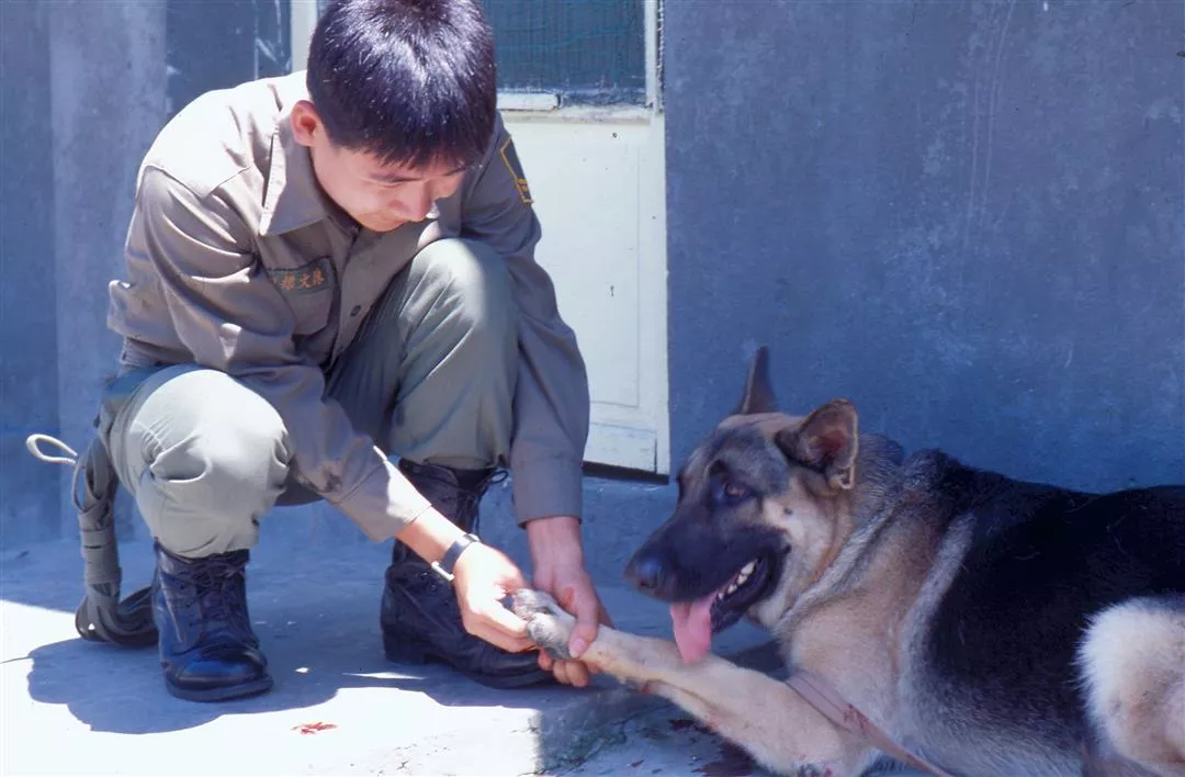 圖2:軍犬管理士照顧受傷的軍犬。(楊永山/鄭元慶)