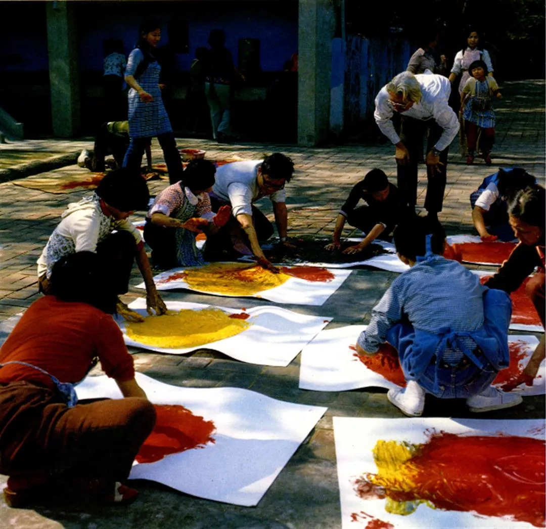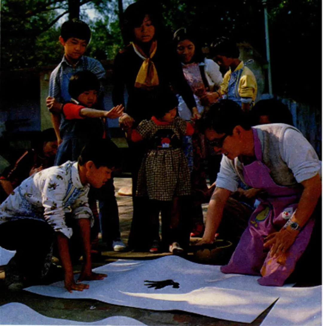 然後,他發給小朋友每人一盆加了顏料的漿糊和一大張圖畫紙,大家就在地上「玩」了起來。