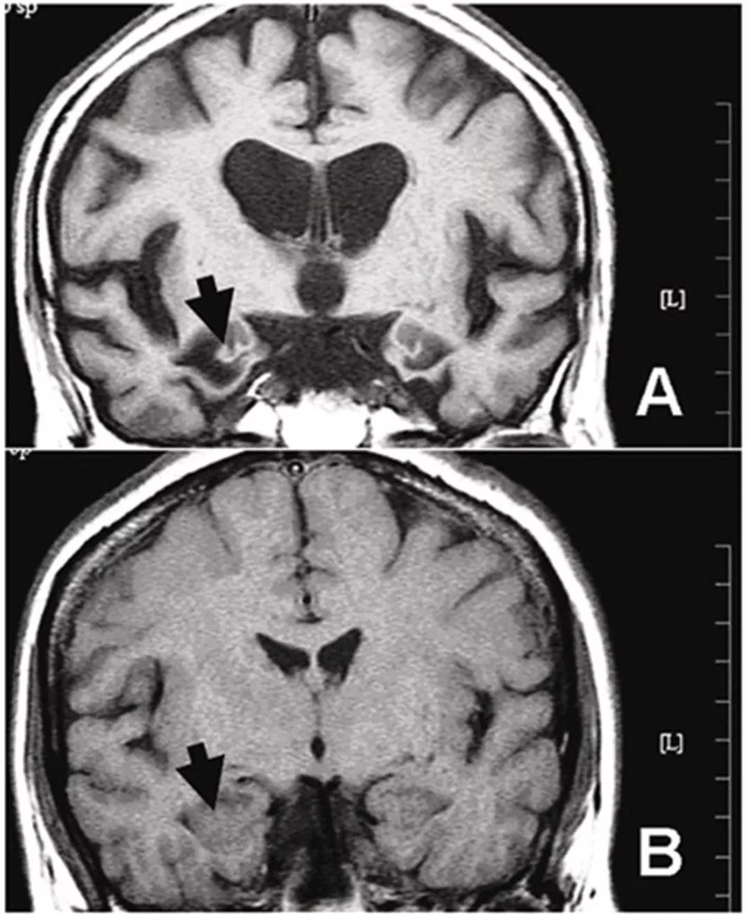 從磁振造影圖中,可以明顯看出失智症患者的海馬迴(箭頭所指處)萎縮。