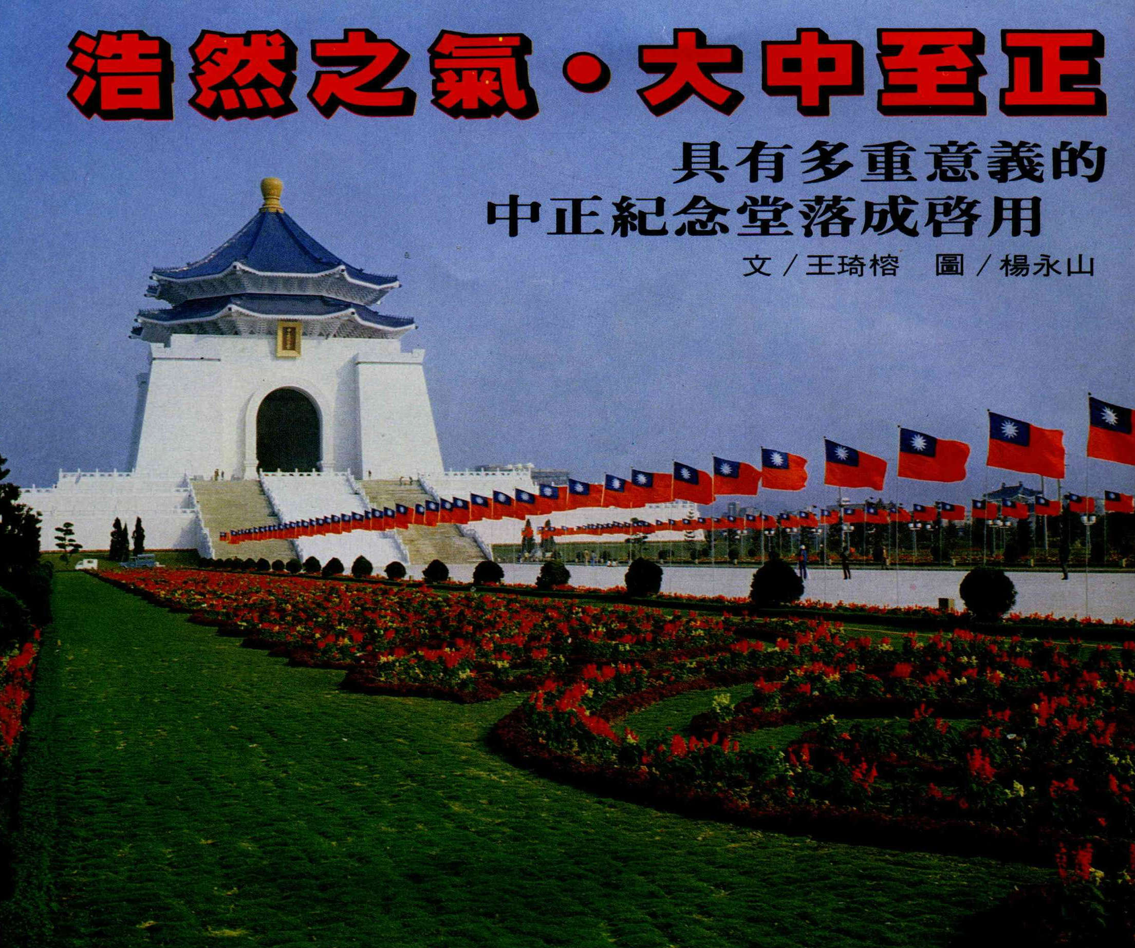 為紀念總統蔣公而興建的中正紀念堂與中正公園,於今年四月四日蔣公逝世五周年紀念日正式落成啟用。這一所莊嚴典雅、工程浩大的建築物,是所有承建工程人員心血與汗水的結晶,更匯注了海內外中國人緬懷蔣公的深摯情感。目前第一期工程完成後,即將進行國家劇院、音樂廳與地下停車場等第二期工程。因此這所重要的紀念性建築具有多重的意義:(一)它是全民表達對蔣公永恆追思的一個具體表徵,(二)它提供大家一個廣闊優美的休閒公園,(三)它是國內建築工程技術的一個新里程碑,(四)它是中國博大精深民族文化的一種展現,(五)它更將提供國內重要藝文活動一個最現代化的展示場所,為發展精緻文化、提昇全民精神生活層次貢獻一分力量。