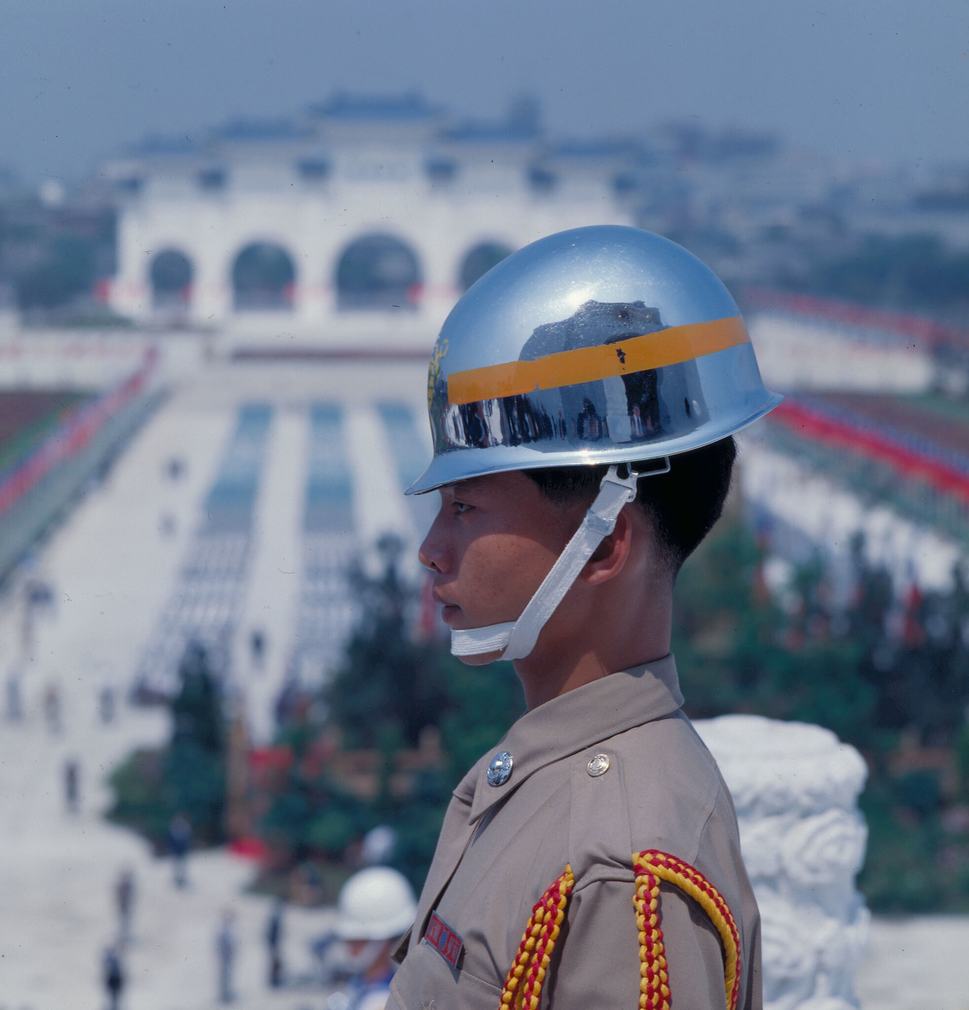 步完瞻仰大道,登上白色石階,石階左右各一座,中間三層平坡,前兩層浮雕靉靉縵雲,第三層是青天白日國徽。