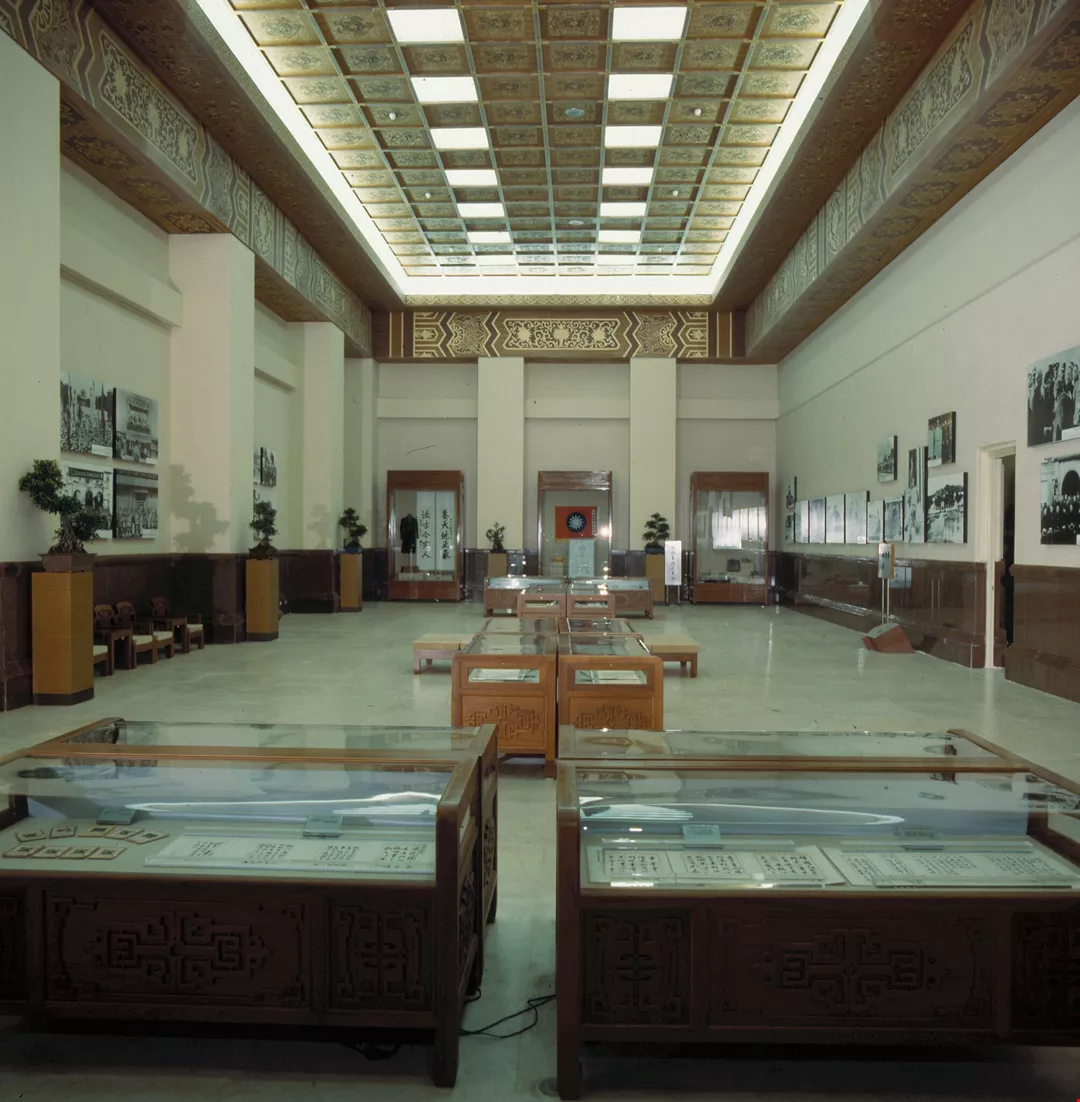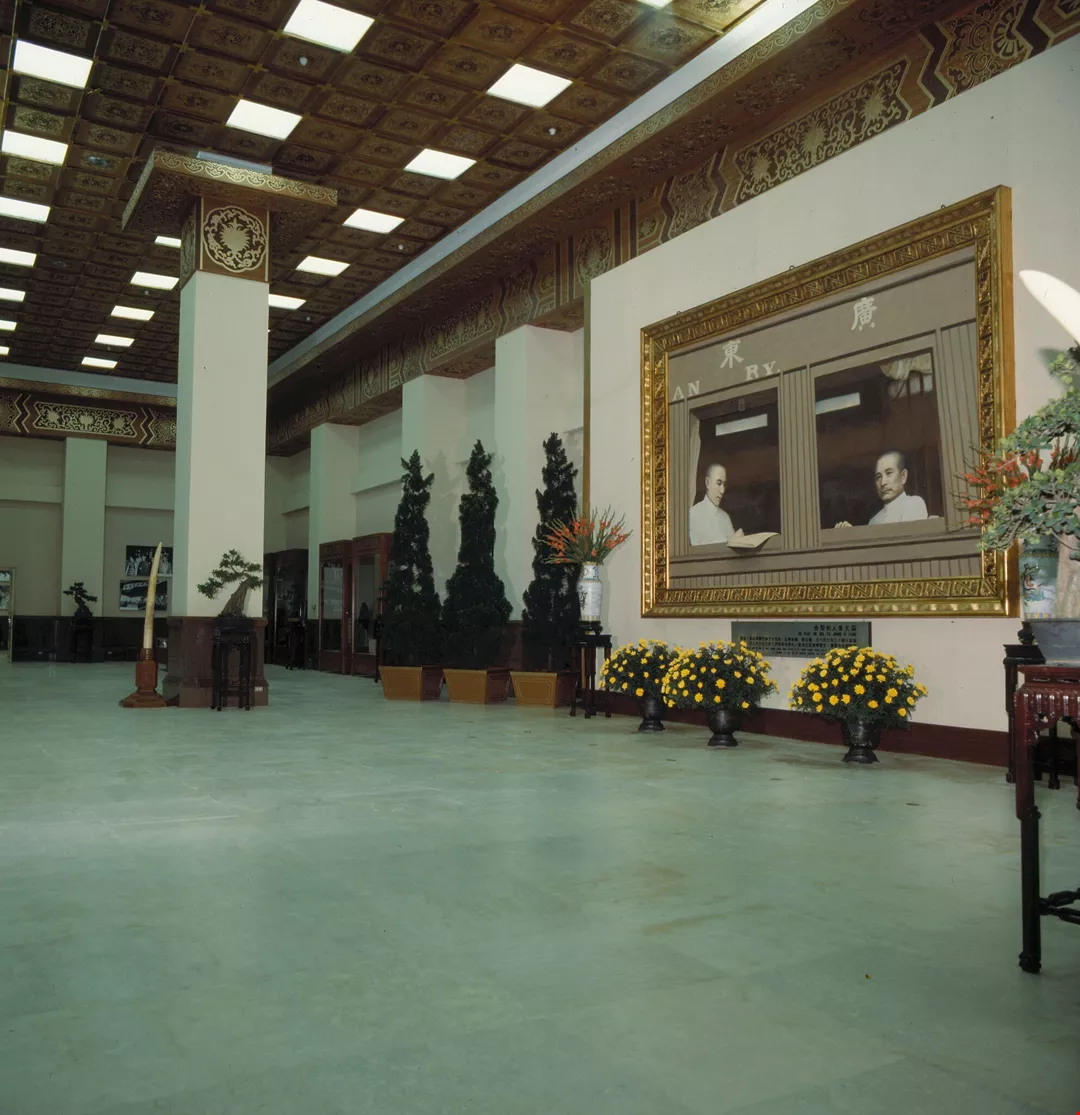 步下廳側的樓梯,或搭乘電梯而下,來到紀念堂的下層。地面是光滑明亮的白色磨石子地,四周樑柱、天花板則都飾以金黃色瀝粉畫,富麗堂皇。