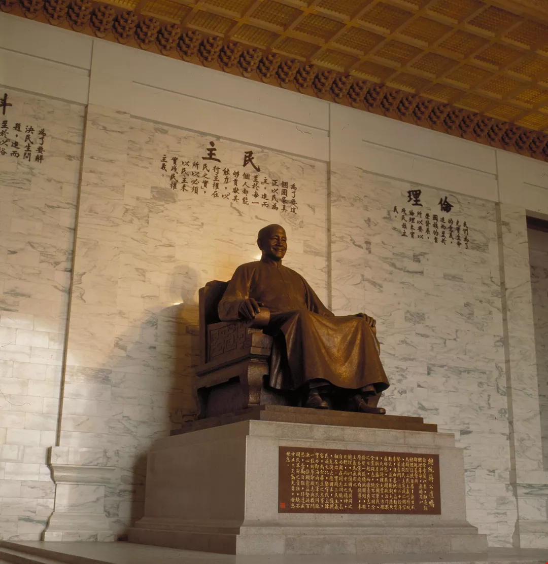 銅像的基座上刻有蔣公遺囑,銅像背後的大理石牆壁上刻著倫理、民主、科學六個大字和蔣公的闡釋。