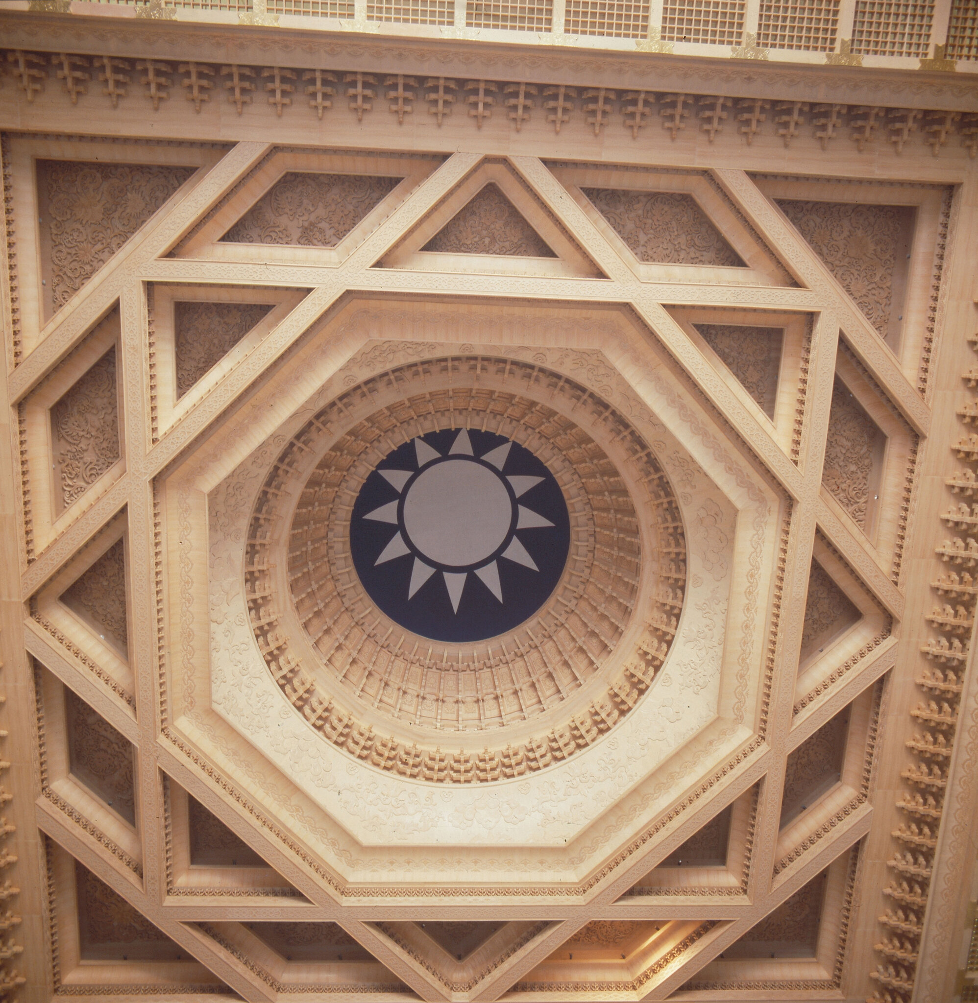 紀念堂上層大廳頂的藻井,中央是個青天白日的國徽,四周圍繞著大大小小的斗栱。