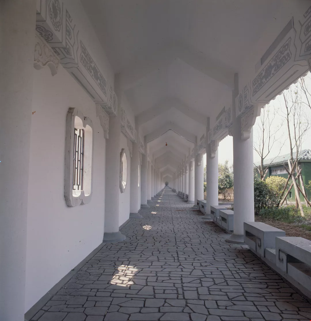 迴廊裡裝有十八種花格和形狀都不同的燈籠窗,古色古香。四個角亭分別建在迴廊轉角處,和雄偉壯麗的紀念堂比較起來,顯得小巧典雅。