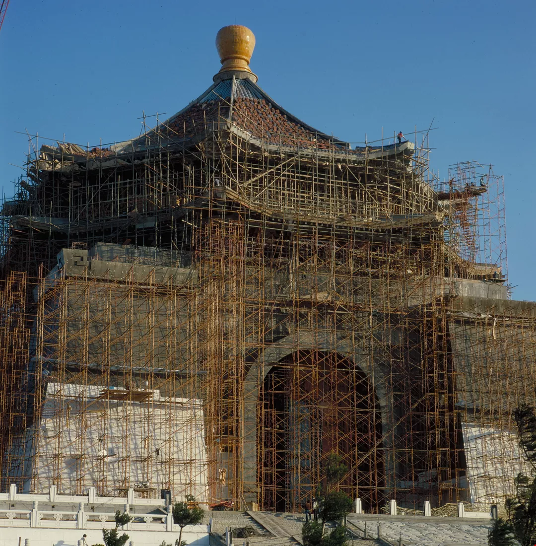 繁密的鷹架支柱,像一層厚繭,密密的箍滿紀念堂和入口碑樓的外圍,彷彿在護衛著一個即將破蛹而出的生命。
