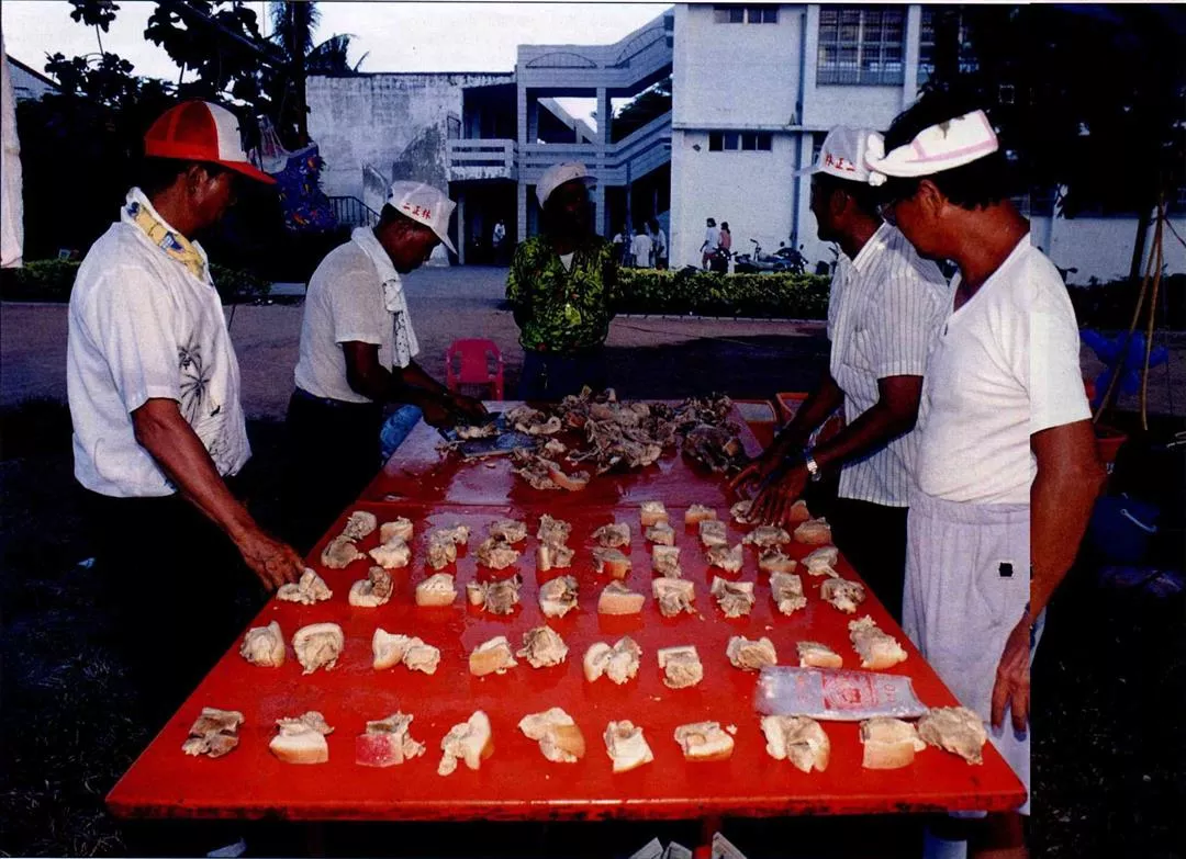 豐年祭裡的豬肉,秀色可餐,等待族人共享。阿美族的歌聲源自生活,總在表達群聚的感覺。(邱瑞金)