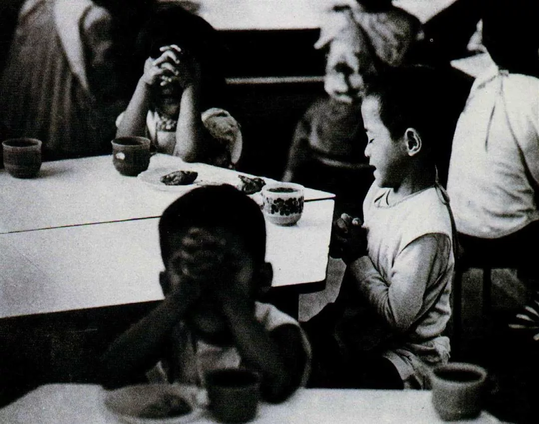 首先大家先做「謝飯禱告」,小朋友把雙手握在額前或胸前,口中念念有詞,有的還相互擠眉弄眼。