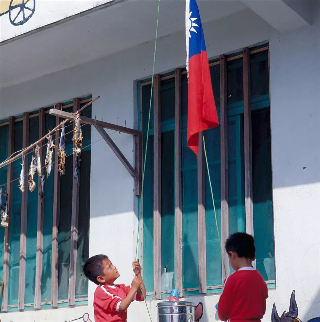 升旗典禮時,兩雙棕色的小手,把美麗的國旗一小段一小段的向上昇起。(楊永山.謝嘯良)