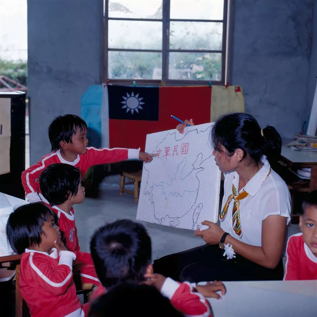 郭老師拿著地圖,教給小朋友:「這是中華民國」。(楊永山.謝嘯良)