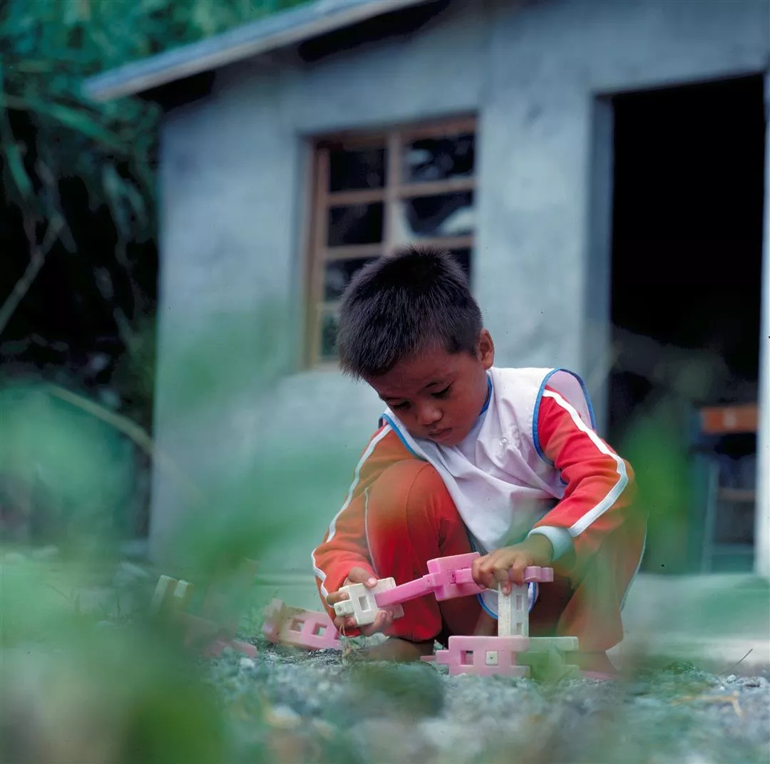 一個小男孩聚精會神地在一旁玩積木。(楊永山.謝嘯良)
