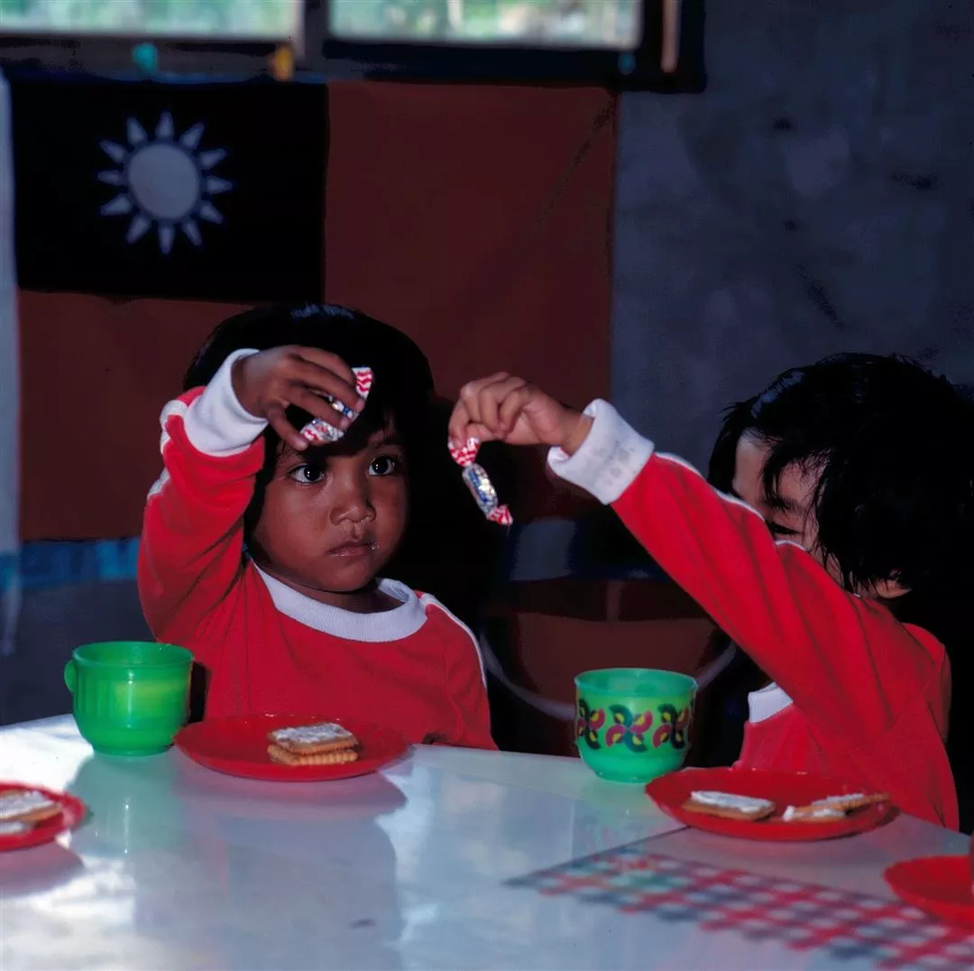 點心時間時,兩個小女孩彼此炫耀自己的糖果。(楊永山.謝嘯良)