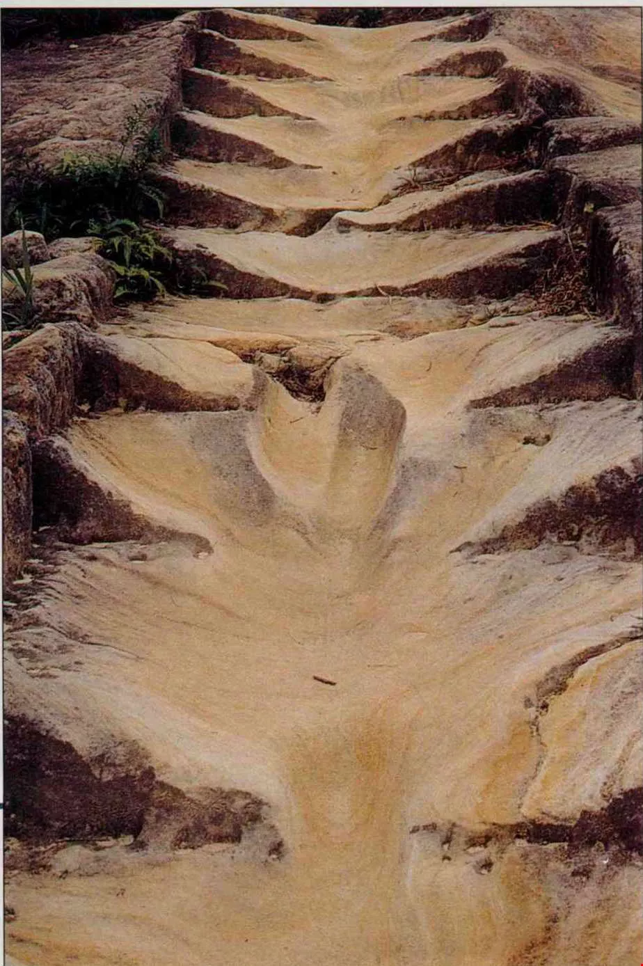 軍艦岩的砂岩地質非常特殊,前些年卻有青少年把它當作練習越野機車的場地,中間碾出的明顯車軌,破壞了景觀原貌。(張良綱)