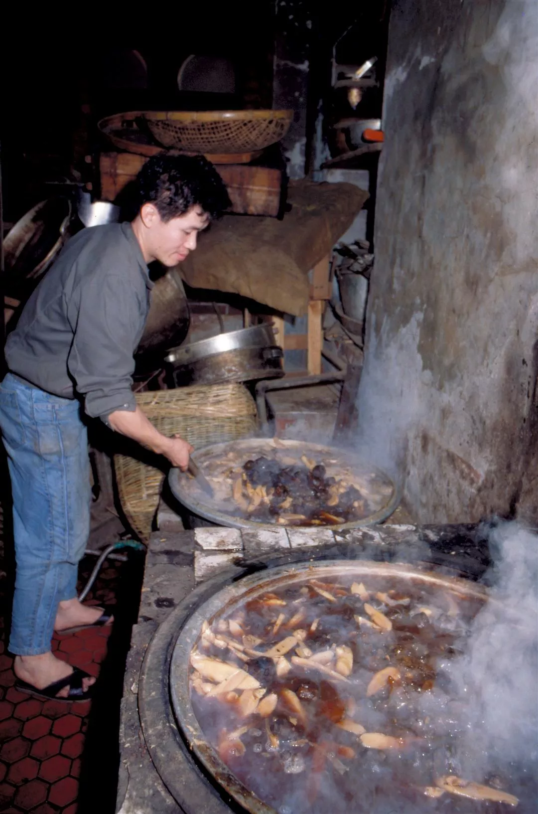 一盆炭火上面扣著一隻大菜鍋,上面烤著附子的切片,這種傳統的炮製過程,現已不多見。(黃麗梨)