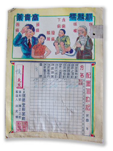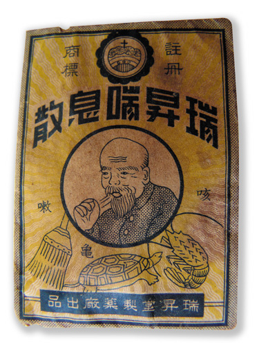 在教育不普及的年代,「看圖知藥意」成了藥品包裝的設計重點,治療「哮喘咳嗽」就畫上蝦、龜、掃把,取其「蝦龜嗽」的台語諧音。