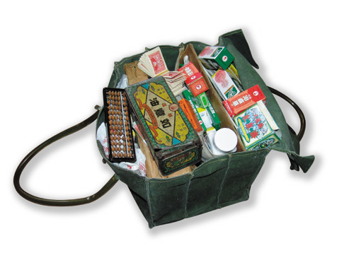 外務員帆布材質的藥袋裡,裝滿各種藥品、客戶紀錄簿和收帳用的算盤。