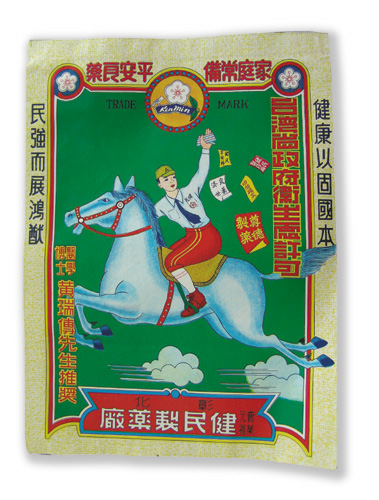 日治時期的藥包外袋上都印製著「台灣總督府認可」等字樣,終戰後則改印「台灣省衛生處認可」;至於在外觀設計上,二次大戰期間的外袋充滿戰爭氣息,除了手執太陽旗的母子廣告之外,還有日軍登上中國萬里長城的繪圖,具有宣揚帝國主義的時代性。終戰後,則改為中華民國軍人、坦克車及俗稱為「老母雞」的C-119運輸機,充滿政治國防宣傳意義。