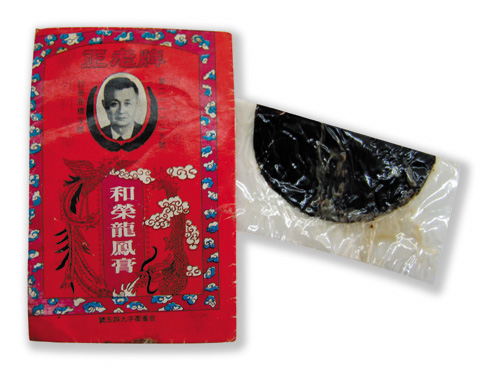 黃大晉拿出日治時期即開始生產、堪稱「外科聖藥」的「和榮龍鳳膏」(俗稱「吊膏」),這種用透明蠟紙為底的黑色藥膏,外觀呈半圓形,質地堅硬,敷用時,需先用文火烤軟,從中撕開後攤平呈圓形,直接貼在患處。