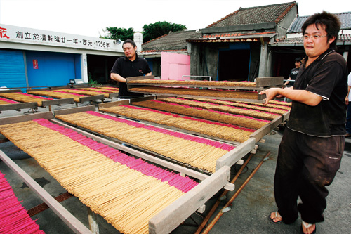 「基本上,製香是個看天吃飯的行業,晴天才能曬香。南台灣日照充足,通常夏天只要一天即可,冬天則須兩天。」早在高中升大學的暑假,施燁志就開始學習製香,卻因太過辛苦而打了退堂鼓。製香師傅不但要會辨別香料質地,手力也很重要,因為過程中的「掄香扇」相當耗體力,所以製香師傅大多都是男性。