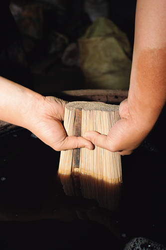 「一般來說,沉香的密度越大,表示凝聚的樹脂越多,質量也越好,所以古人常以能否沉入水中,將沉香分為不同的級別。」施起燻一邊將一塊純度百分百、通體烏亮的祖傳沉香塊丟進水中,一邊不忘說明,入水若沉者,名為「沉水香」;次之,半浮半沉者,名為「棧香」;再次,稍稍入水而漂於水面的,名為「黃熟香」。