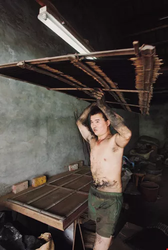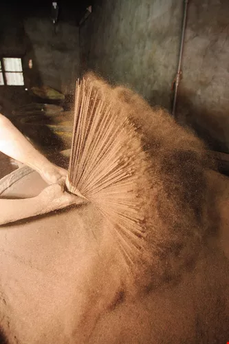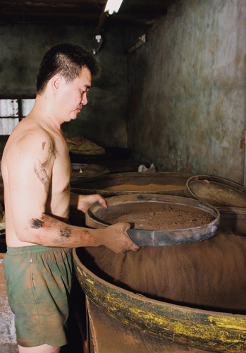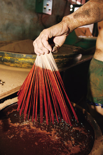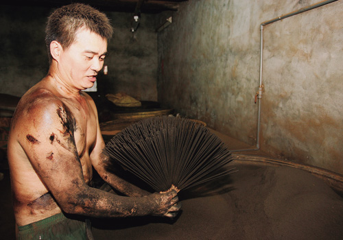 其他步驟如拌粉、滾香,以前都用手工,需要足夠的手勁,雖說現在已有機器代勞,不過有些動作像最後的染色,如果腕力不夠,整把香一散掉,就前功盡棄了。在施金玉三房製香15年的童寶龍師傅,右手手臂就明顯比左手粗了許多。而且做香、拌香時需要撥灑香粉,常常搞得一屋子都是粉塵,一旦遇到旺季製香量大時,師傅的臉就被香粉沾得一臉漆黑。沒有光鮮亮麗的表象,只有粉塵為伍的日子,自然吸引不了年輕人投入。