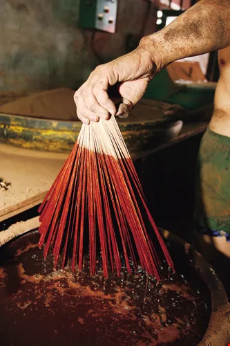 7、染色,曬硬了之後,把下端的香腳染成紅色,染好後再曬一天。