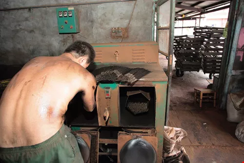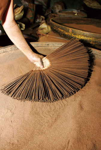 「將沉香和檀香兩種原料研磨成粉,加入多達20種的祖傳配方,再以老師傅的手上真功夫,才能做出最上乘的香。」施起燻表示,百分百沉香塊燃燒的味道較淡,若隱若現,而要讓香味芳郁,就必須像廚師「調理」每道菜一樣,成敗的關鍵,就在香料的靈活使用上。