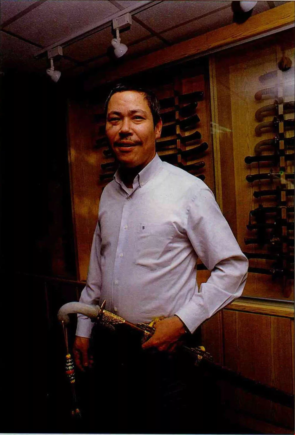 到大陸投資生產金屬製品的台灣商人陳朝波,經過三年的研究,終於一步步將扣鳴刀復原成功。(薛繼光)