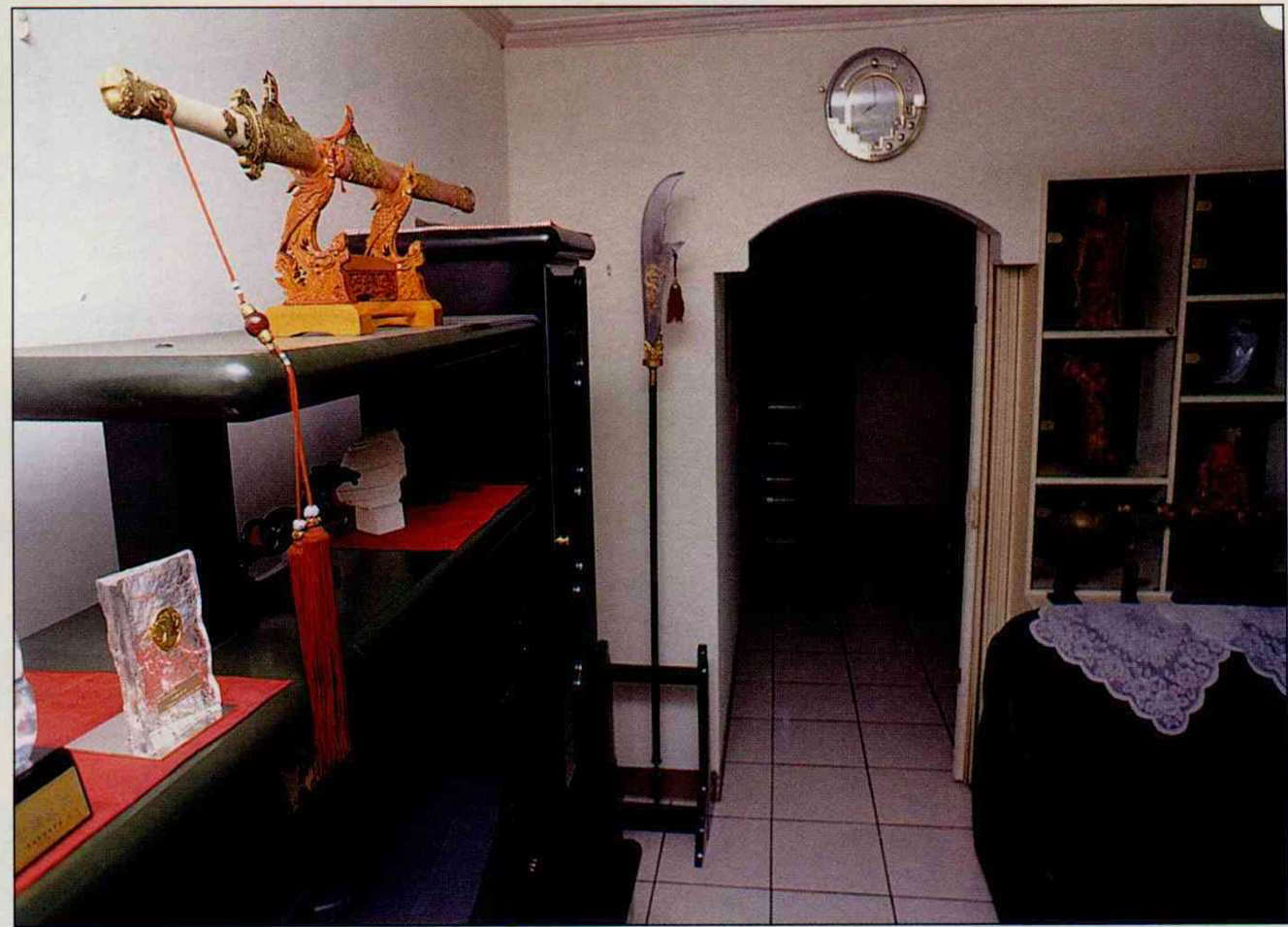 牆邊豎著青龍偃月刀,架上橫著貞武寶劍(仿唐),魍魎魑魅一律止步,但不知可擋得住今天的宵小閒雜?(薛繼光攝)(薛繼光攝)