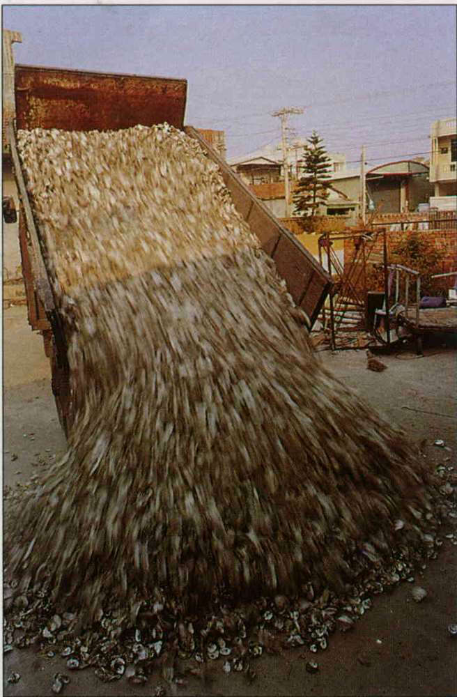 從海邊蚵田採集的蚵仔,需用「載蚵仔車」運到莊裏,由人工挑撿。飼蚵,是粘厝莊很重要的經濟來源。(張良綱)