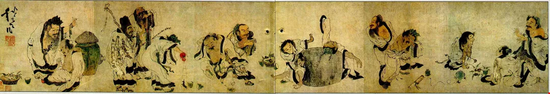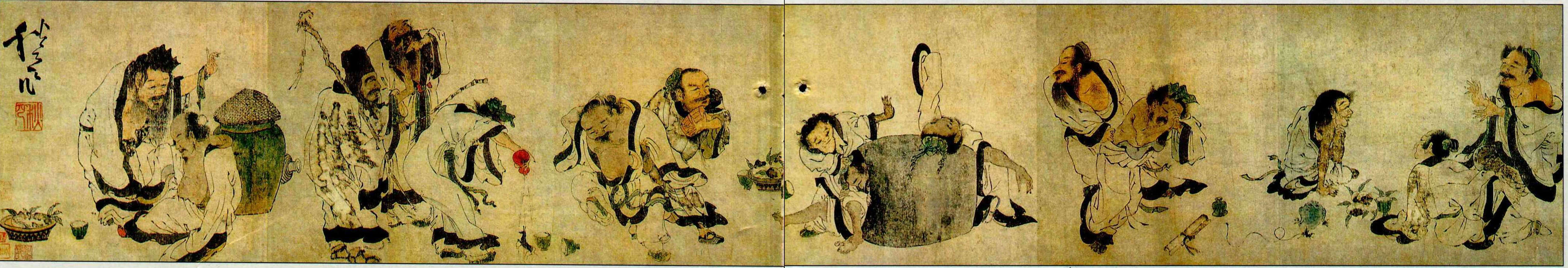 古人行酒令,往往花招百出,圖為元朝顏輝所繪的「醉仙圖」局部,由其中人物的動作神態,可約略想見當時人劃拳的情狀。(故宮文物月刊提供)