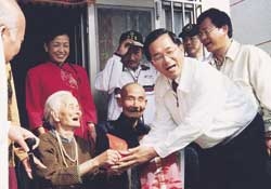執政的一千多個日子裡,陳總統依舊是輕裝便履,全台走透透。圖為其遠赴嘉義縣東石鄉祝賀林老夫婦結褵八十週年慶一景。(新聞局提供)